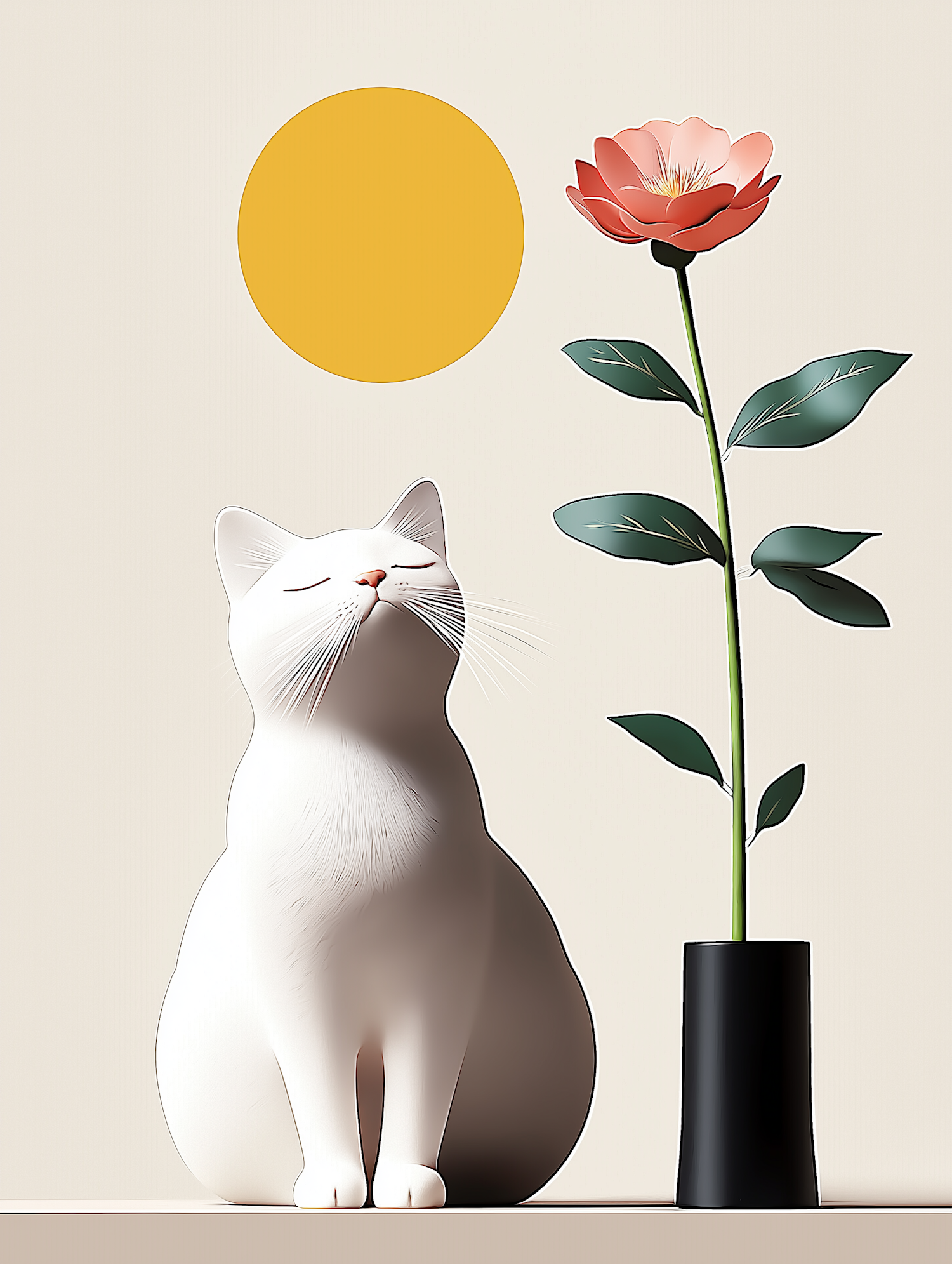 Minimalist illustration of a serene white cat with a red flower and a yellow sun, creating a harmonious and calming scene.