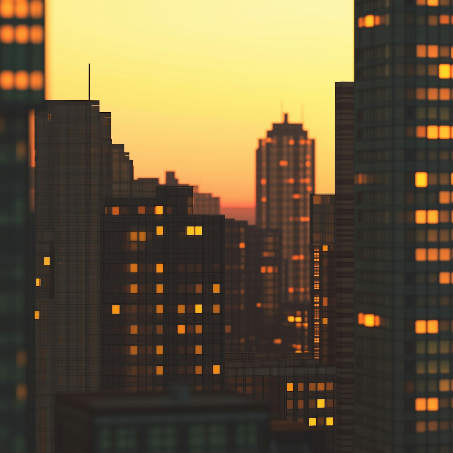 A glowing cityscape at sunset with skyscrapers silhouetted against a golden sky and windows warmly lit, creating a tranquil urban vibe.