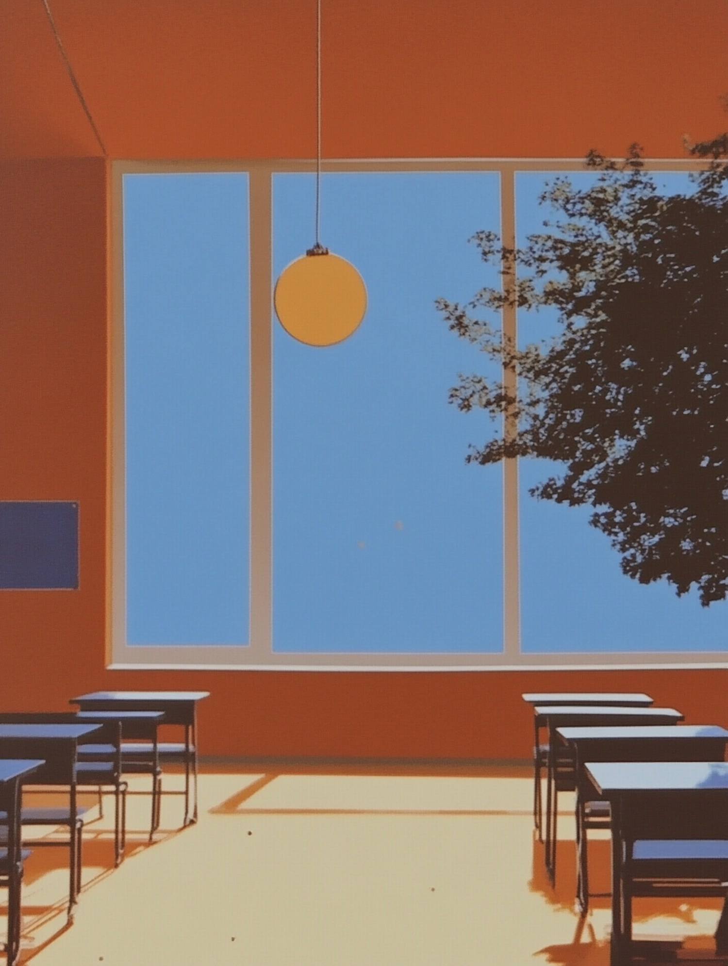 Vibrant classroom with orange walls, blue desks, and a large window showing a clear sky and tree silhouette.