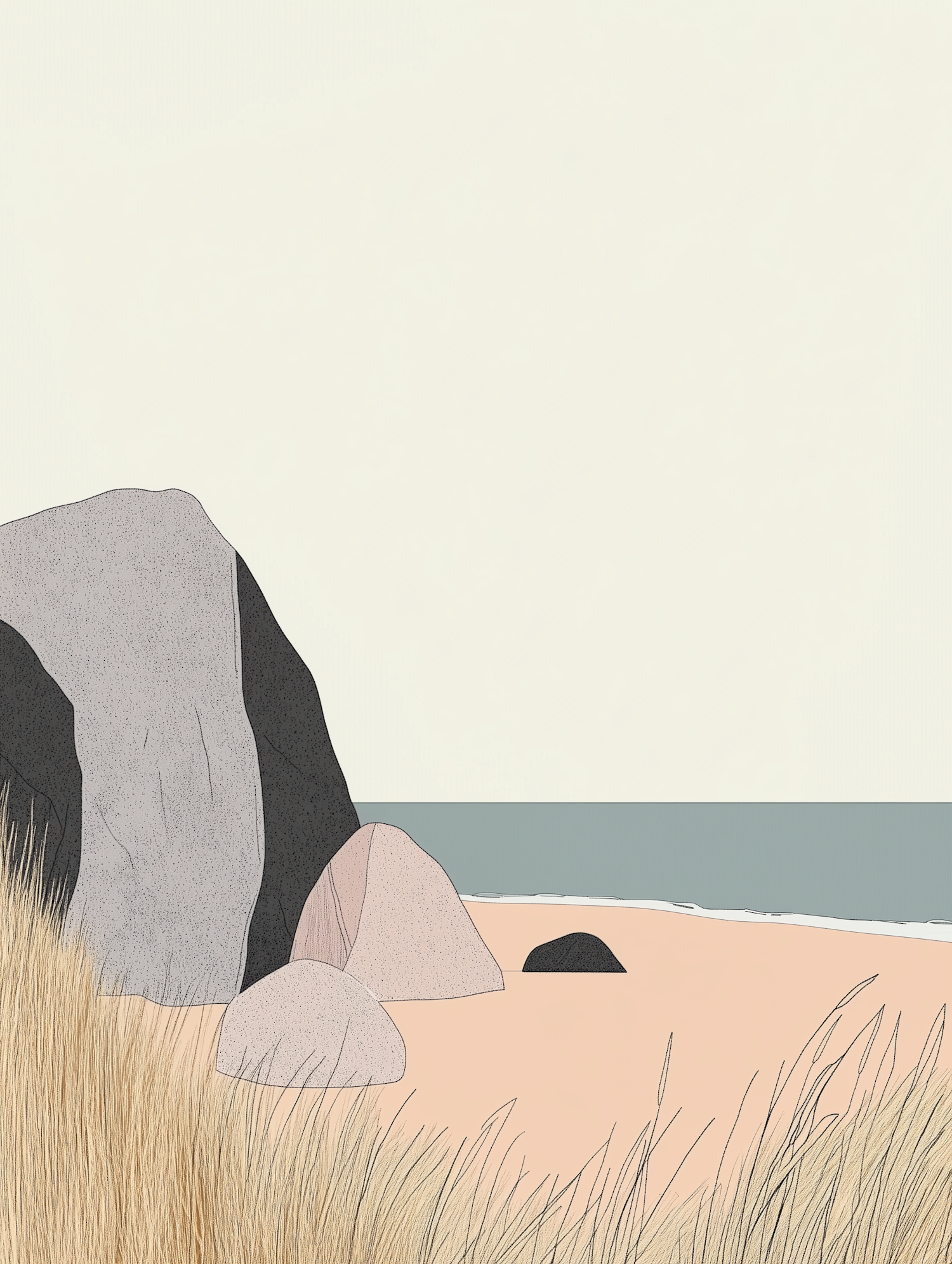 Minimalist beach illustration with rocks, golden grasses, and a calm ocean under a pale sky. Soft, earthy tones create tranquility.