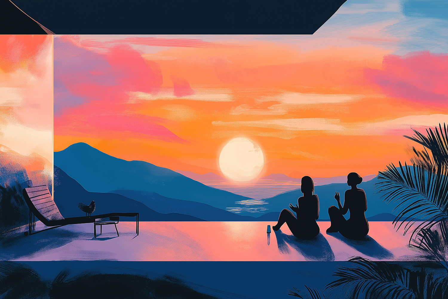 Silhouetted figures by an infinity pool at sunset, with vibrant skies and distant mountains. A tranquil, tropical scene.