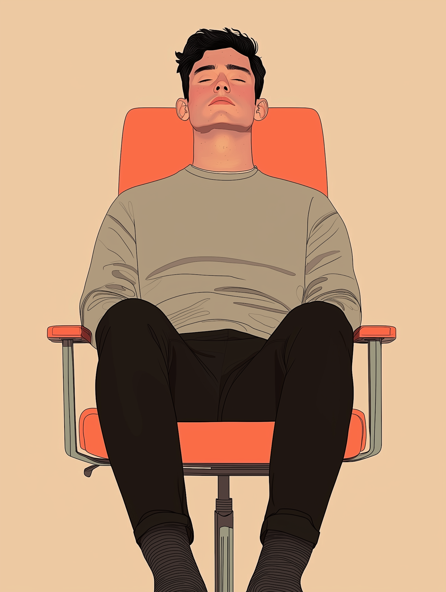 Person with blurred face sits in an orange chair, wearing a gray shirt and black pants, against a beige background.