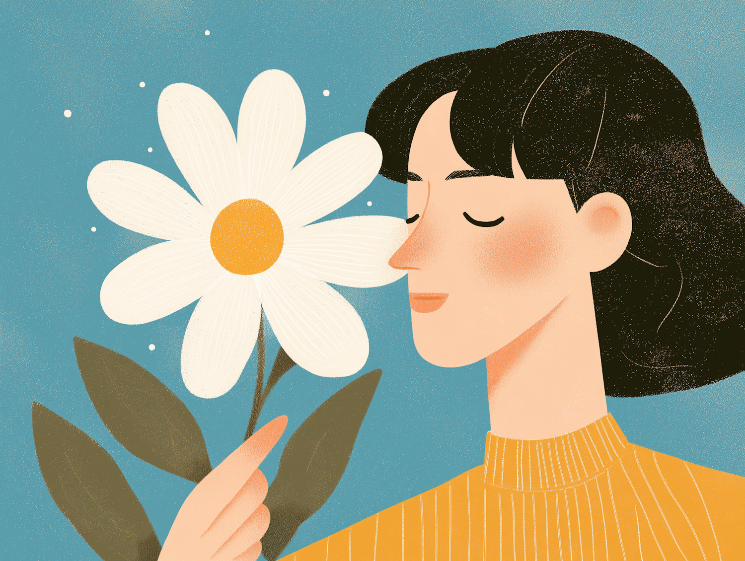 Illustration of a serene person with a daisy, eyes closed, in a mustard sweater against a teal background. Peaceful and whimsical vibe.