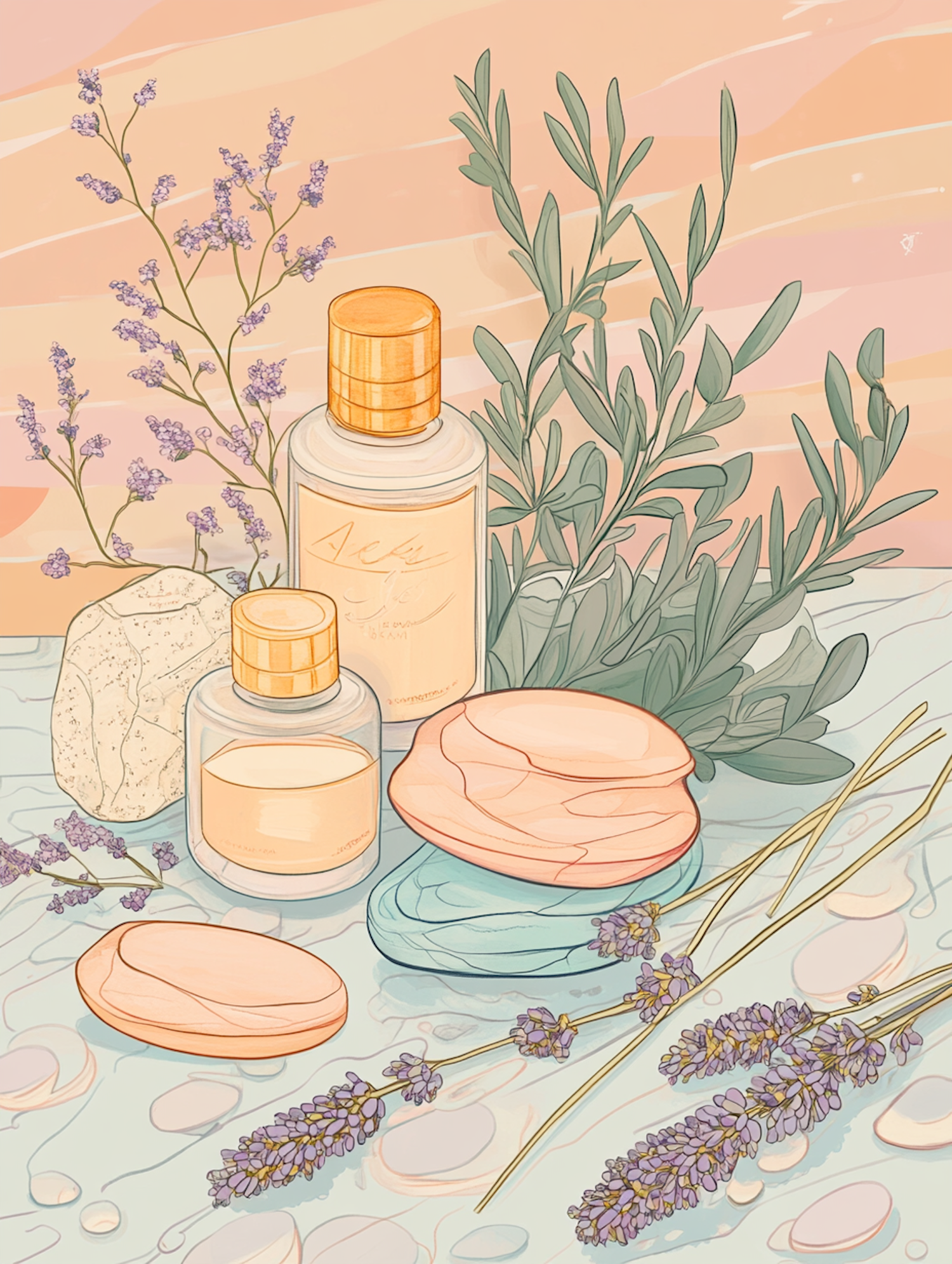 Elegant spa-themed illustration with bottles, lavender, and stones on a pastel background, evoking relaxation and natural beauty.