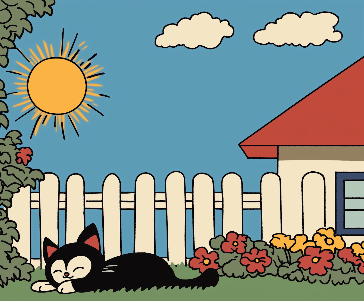 Cartoon cat relaxing in a sunny garden with flowers, a picket fence, and a house with a red roof. Bright sun and clouds in the sky.