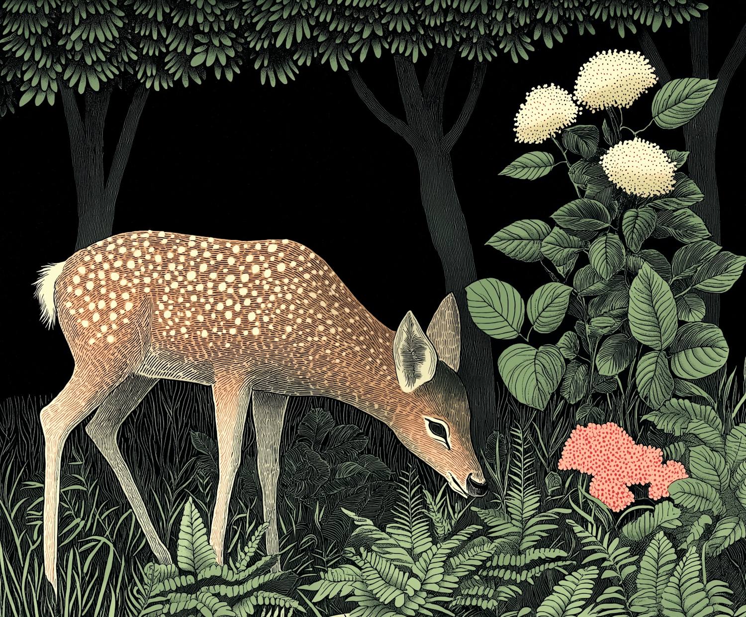Illustration of a spotted deer grazing in a lush forest with ferns and white flowers, under a canopy of trees.