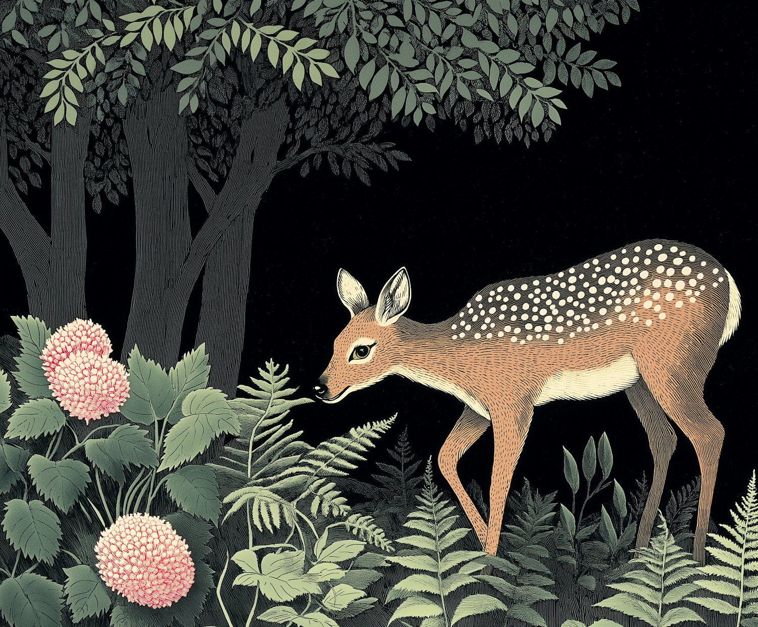 Illustration of a young deer in a lush forest with pink hydrangeas and green ferns, creating a serene and peaceful atmosphere.