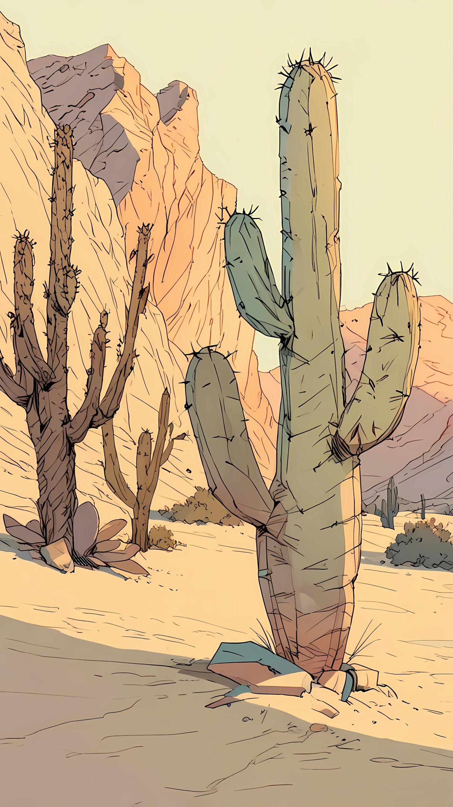 Illustrated desert scene with cacti and rugged cliffs, showcasing fine textures and warm tones of an idyllic arid landscape.