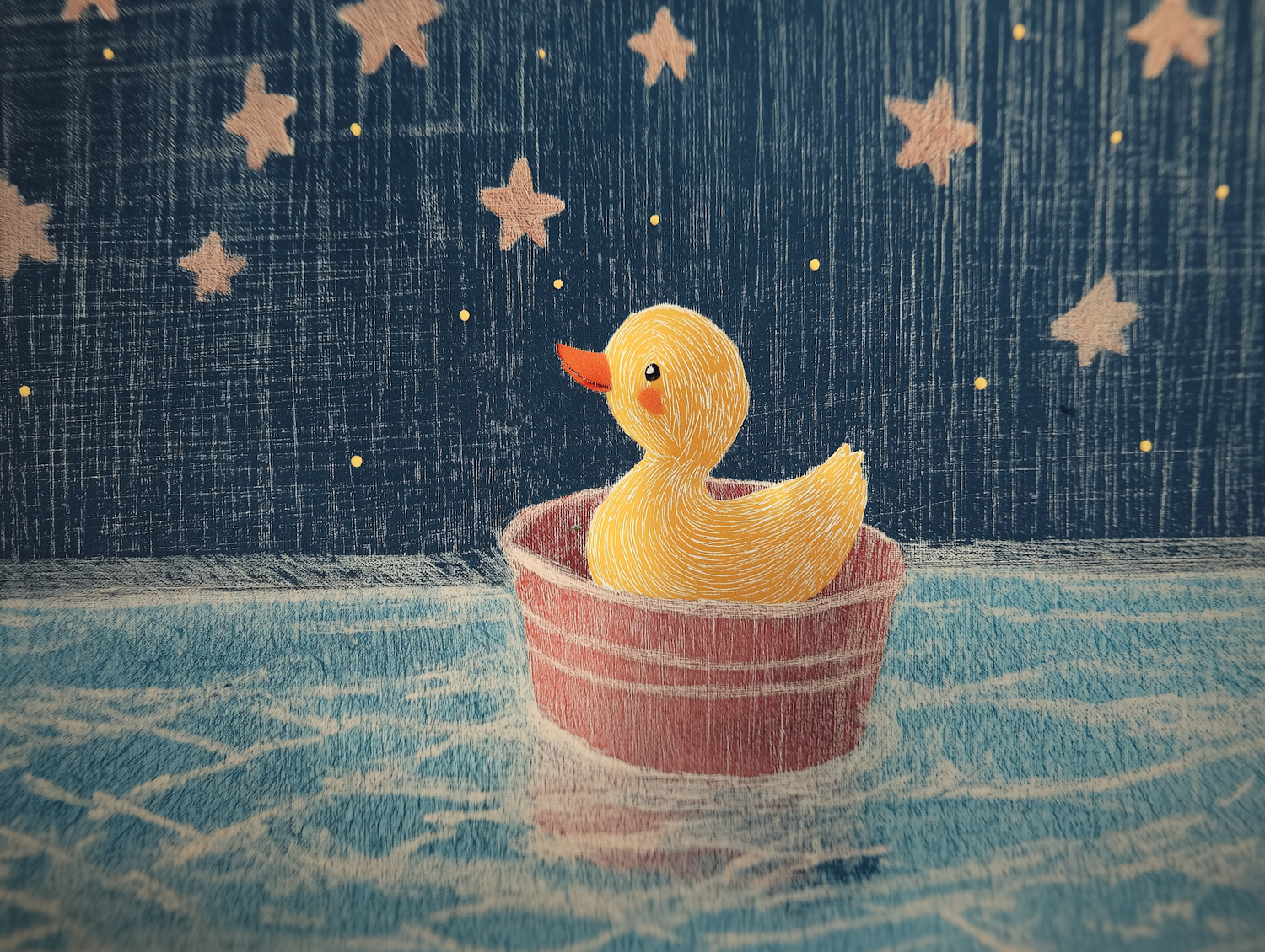 Charming illustration of a yellow rubber duck in a red tub under a starry night sky, evoking a whimsical and playful atmosphere.