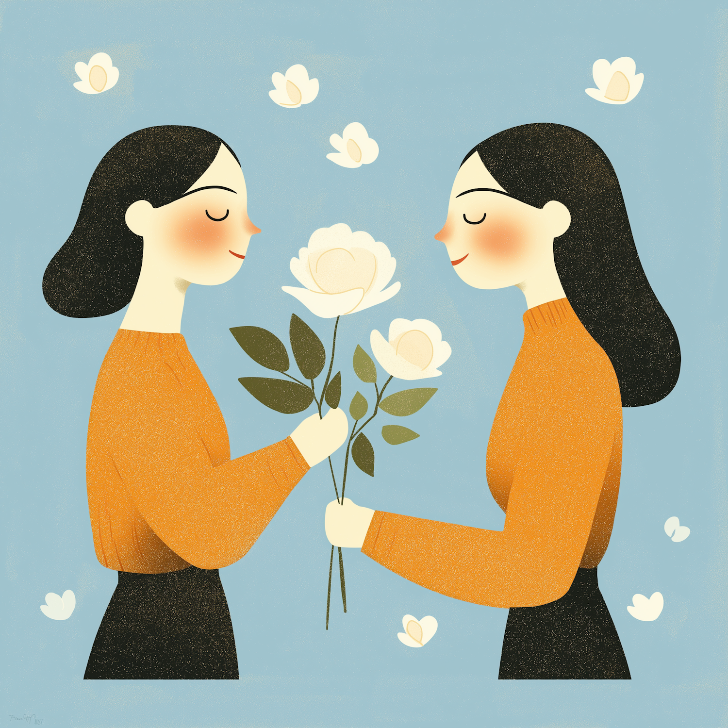 Two stylized figures exchange white flowers, set against a soft blue background, symbolizing peace and harmony.