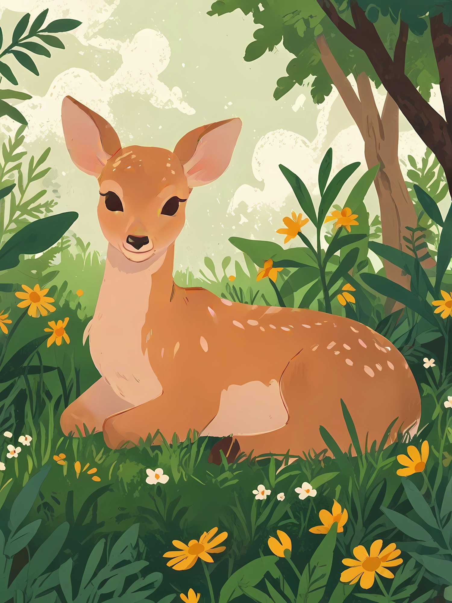 Illustration of a serene deer resting in a vibrant meadow with colorful wildflowers and lush greenery.