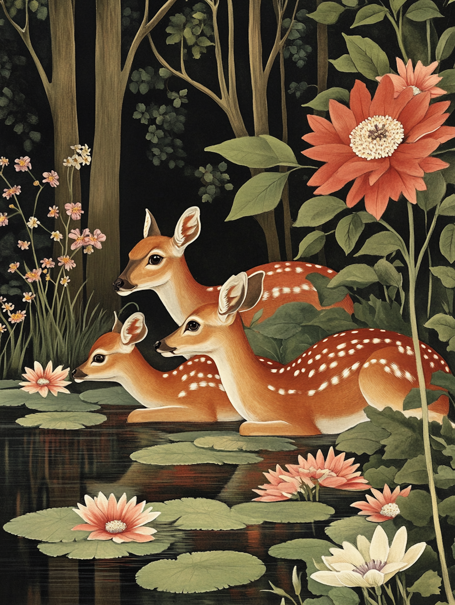 Three spotted deer rest by a pond with lily pads and flowers in a tranquil forest setting.
