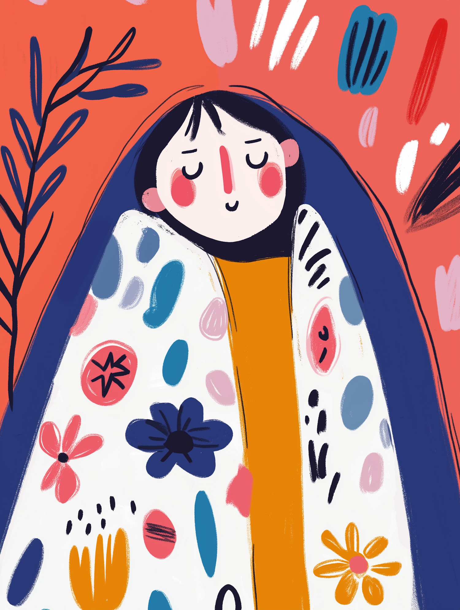 Whimsical illustration of a person wrapped in a colorful, patterned blanket against a coral background.