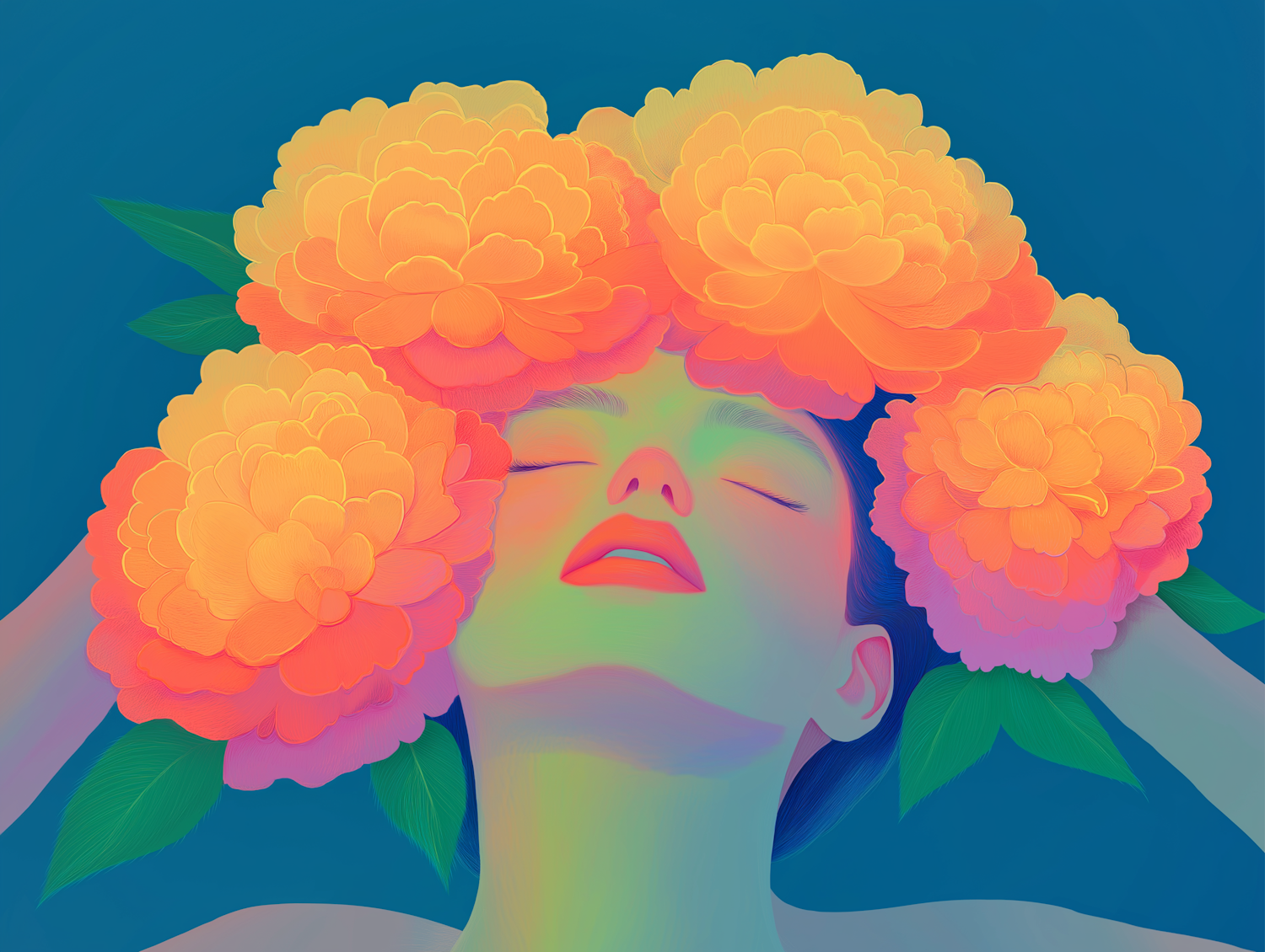 Surreal illustration of a serene woman with luminous peonies as a crown, vibrant colors, and a calming blue background.