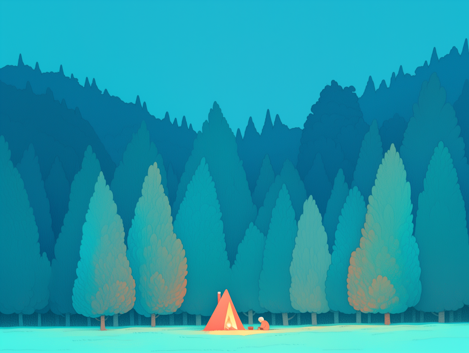 Serene forest illustration with a vibrant orange tent and a person sitting, surrounded by lush green and blue trees under a clear blue sky.