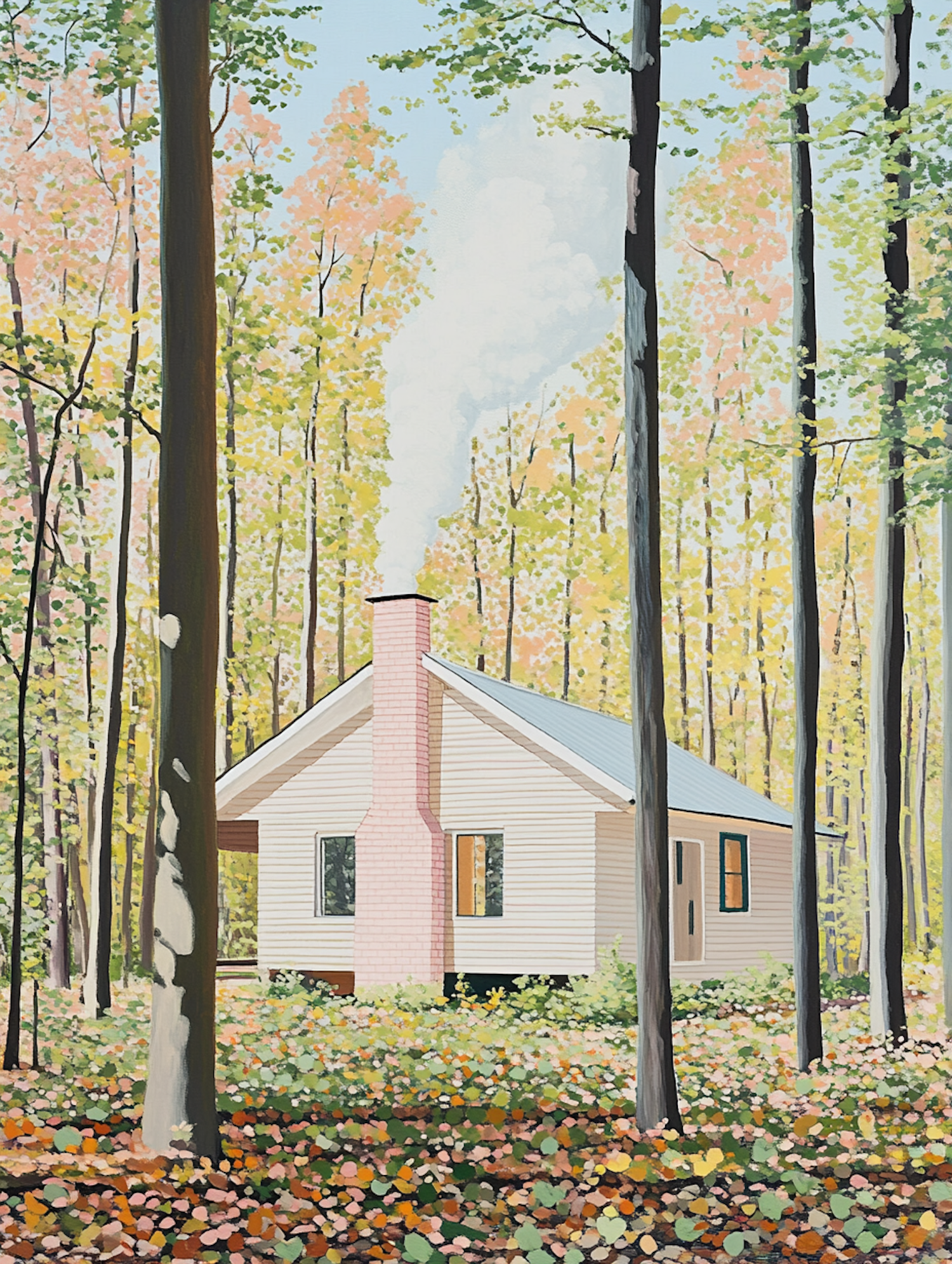 Charming house with pink chimney nestled in a vibrant autumn forest, surrounded by tall trees and colorful leaves.