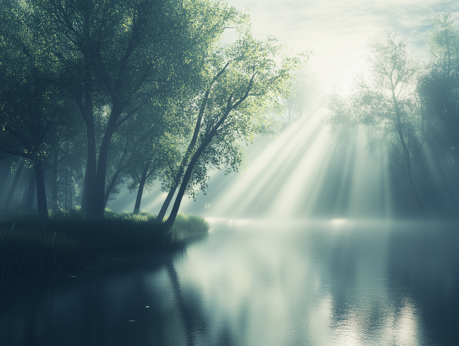 Peaceful forest scene with sunlight streaming through trees onto a calm, reflective lake surrounded by lush greenery.