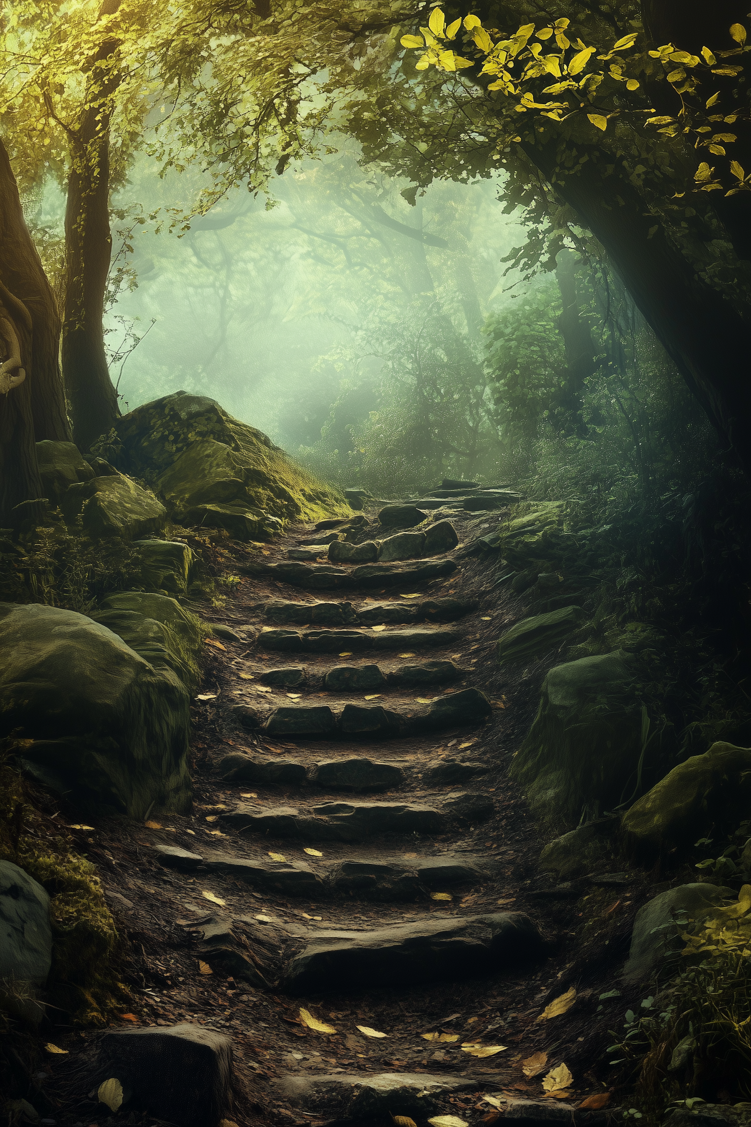 Enchanting forest path with stone steps, lush greenery, and sunlight filtering through the trees, creating a mystical atmosphere.