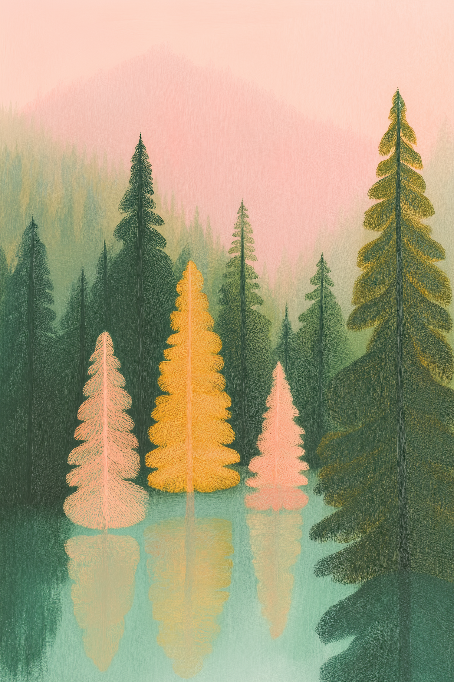Whimsical forest illustration with colorful trees reflected in calm water, set against a soft pink and green misty background.