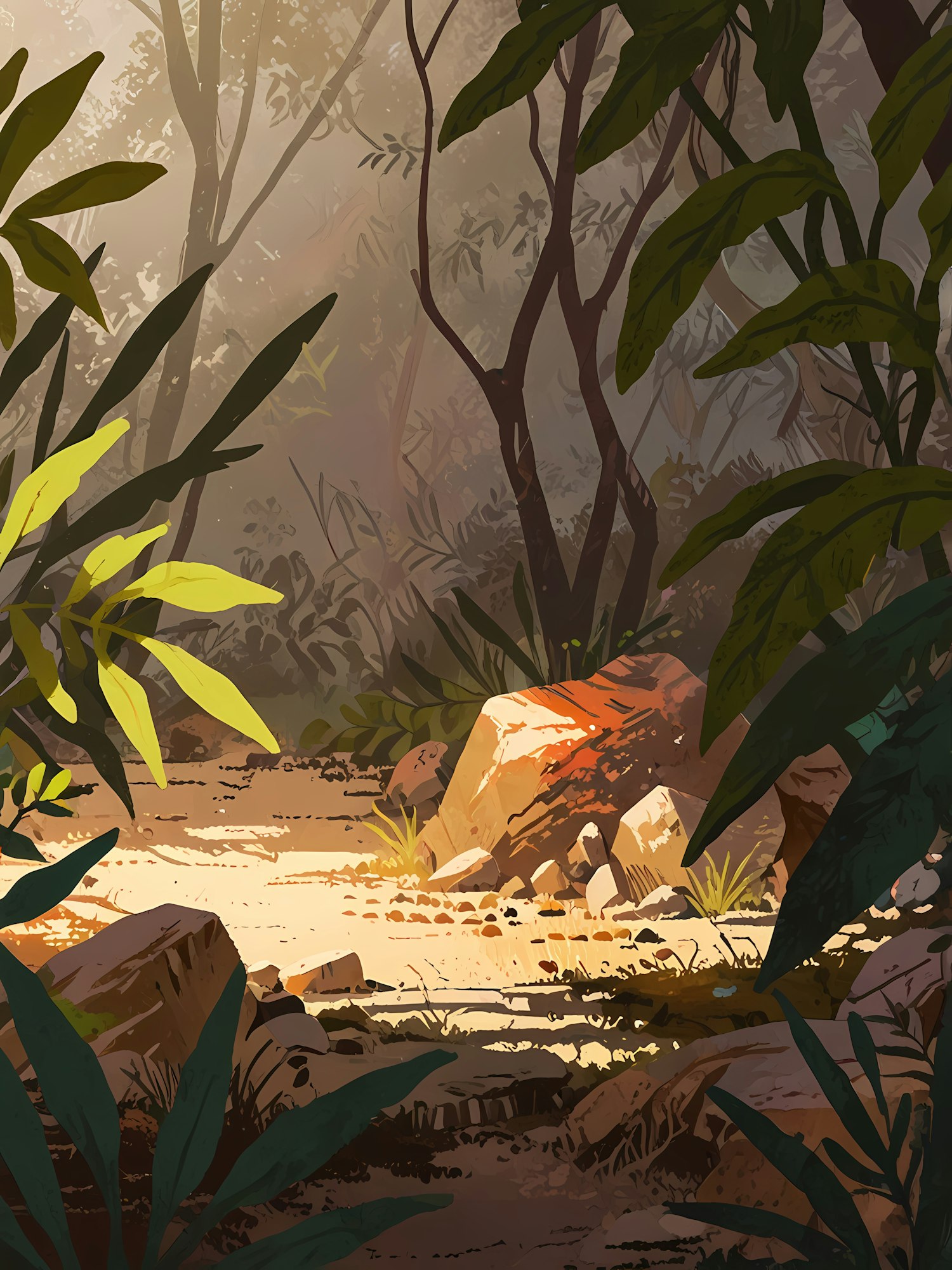 Sunlit forest path with lush foliage and a prominent boulder, creating a serene and tranquil natural setting.