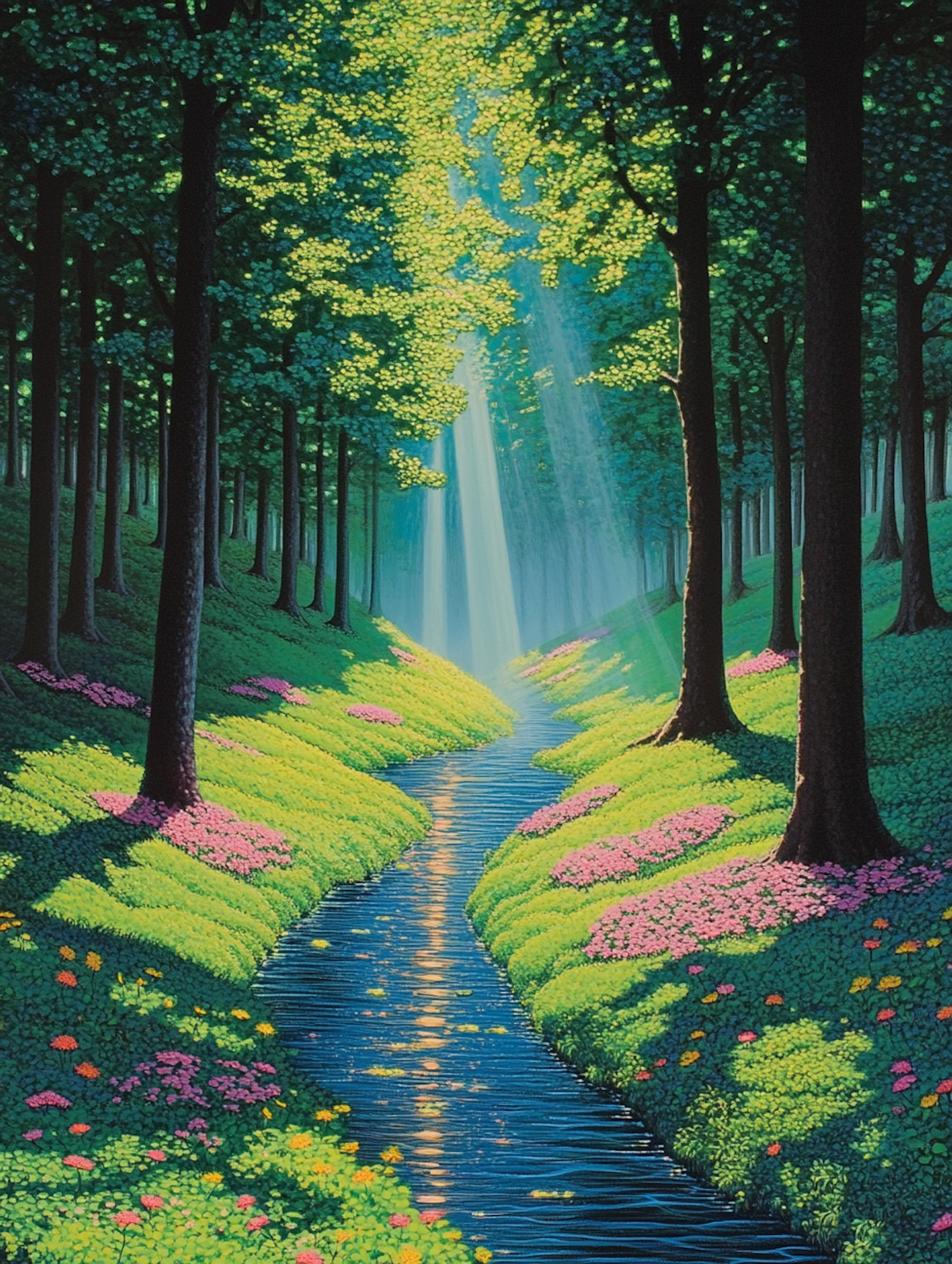 Sunlit forest with a sparkling stream, vibrant flowers, and lush greenery creating a tranquil and magical atmosphere.