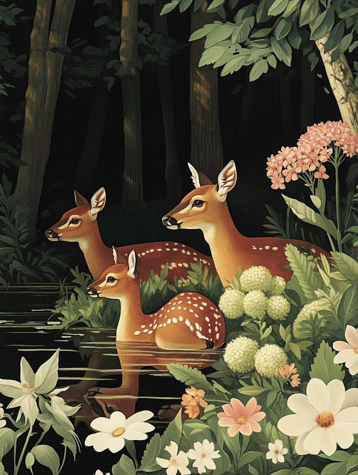 Three deer in a tranquil forest pond surrounded by lush greenery and colorful flowers, creating a serene wildlife scene.