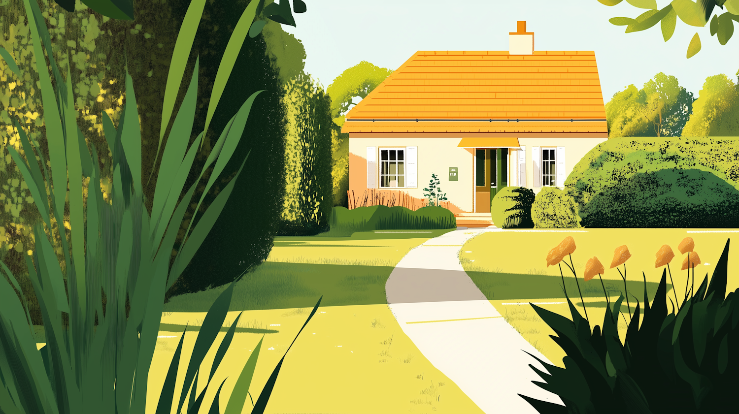 Charming illustration of a cozy house with an orange roof, surrounded by lush greenery and a neat garden path.