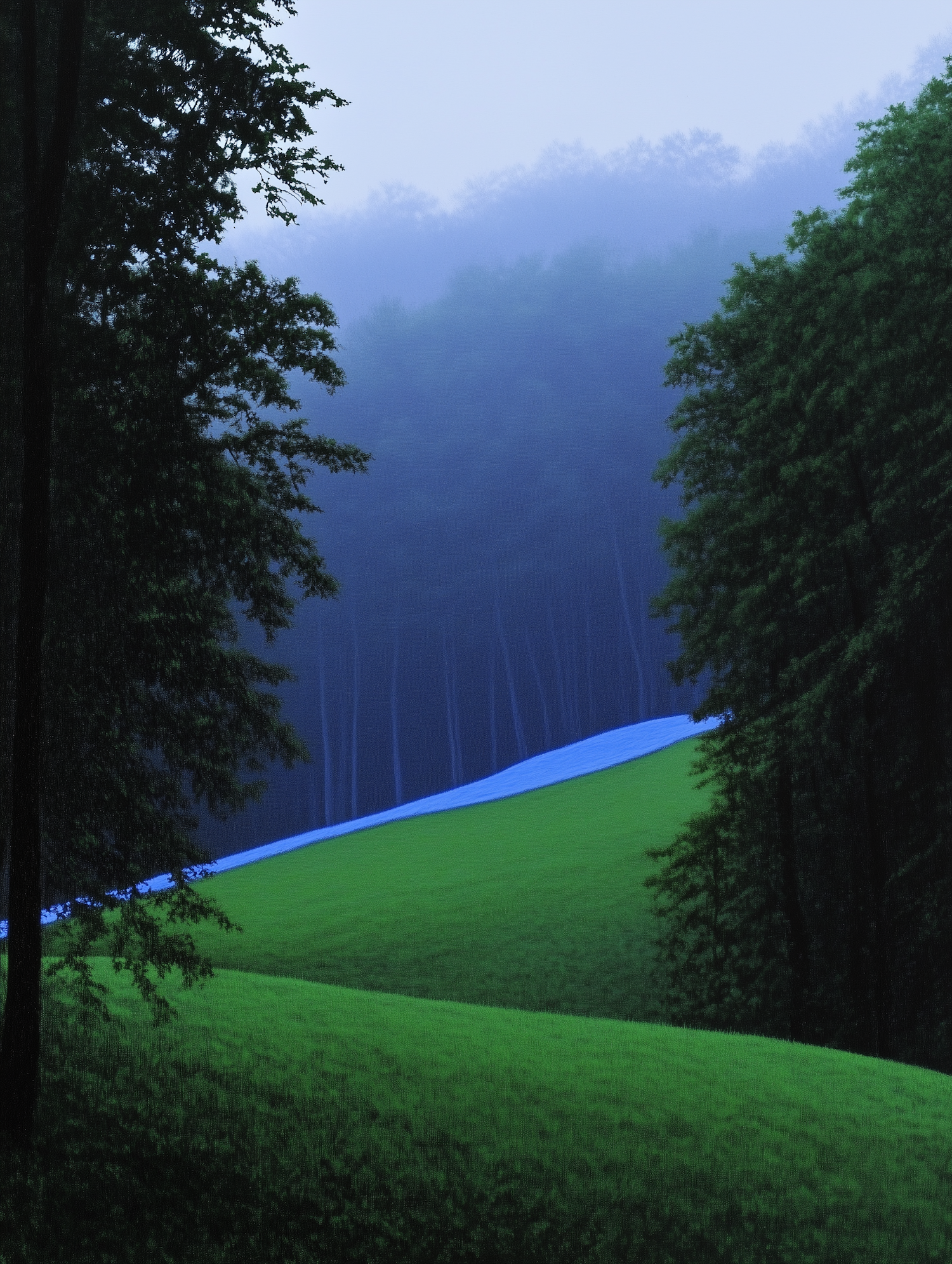 Tranquil green hills with a vivid blue stream and misty forest backdrop, creating a serene and picturesque landscape.