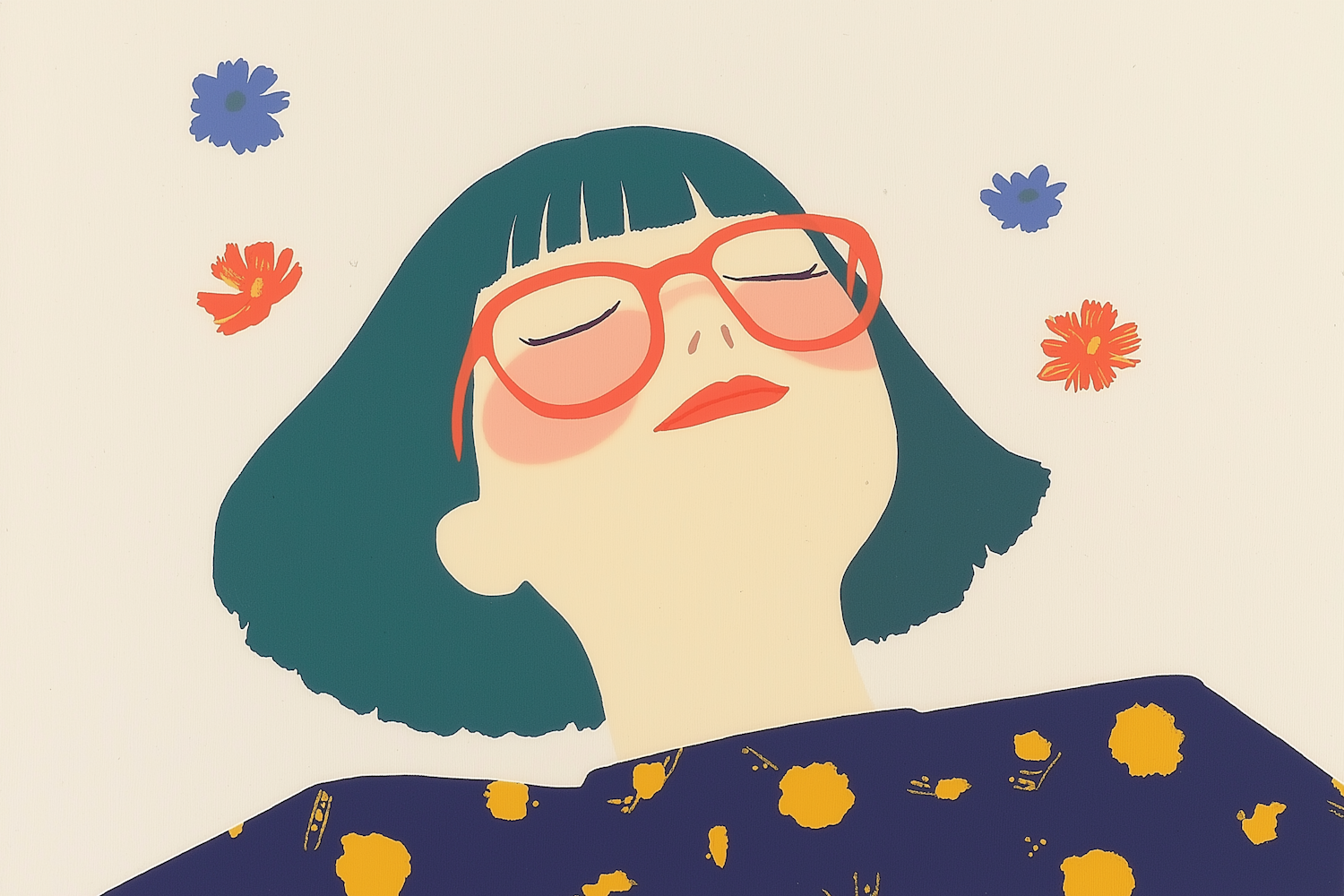 Stylized illustration of a person with green hair, red glasses, and floral top, surrounded by colorful flowers on a neutral background.