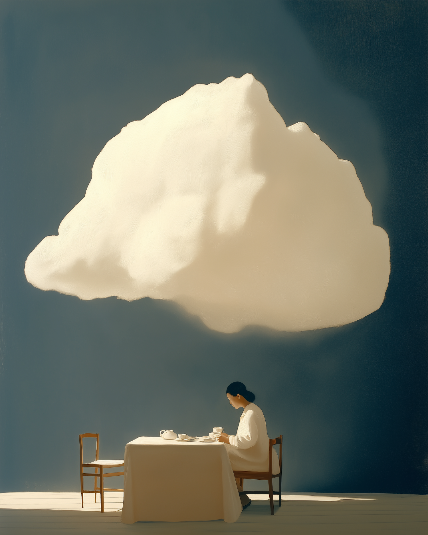 A woman sits at a table under a large indoor cloud, enjoying a quiet moment with tea. The scene is serene and dreamlike.