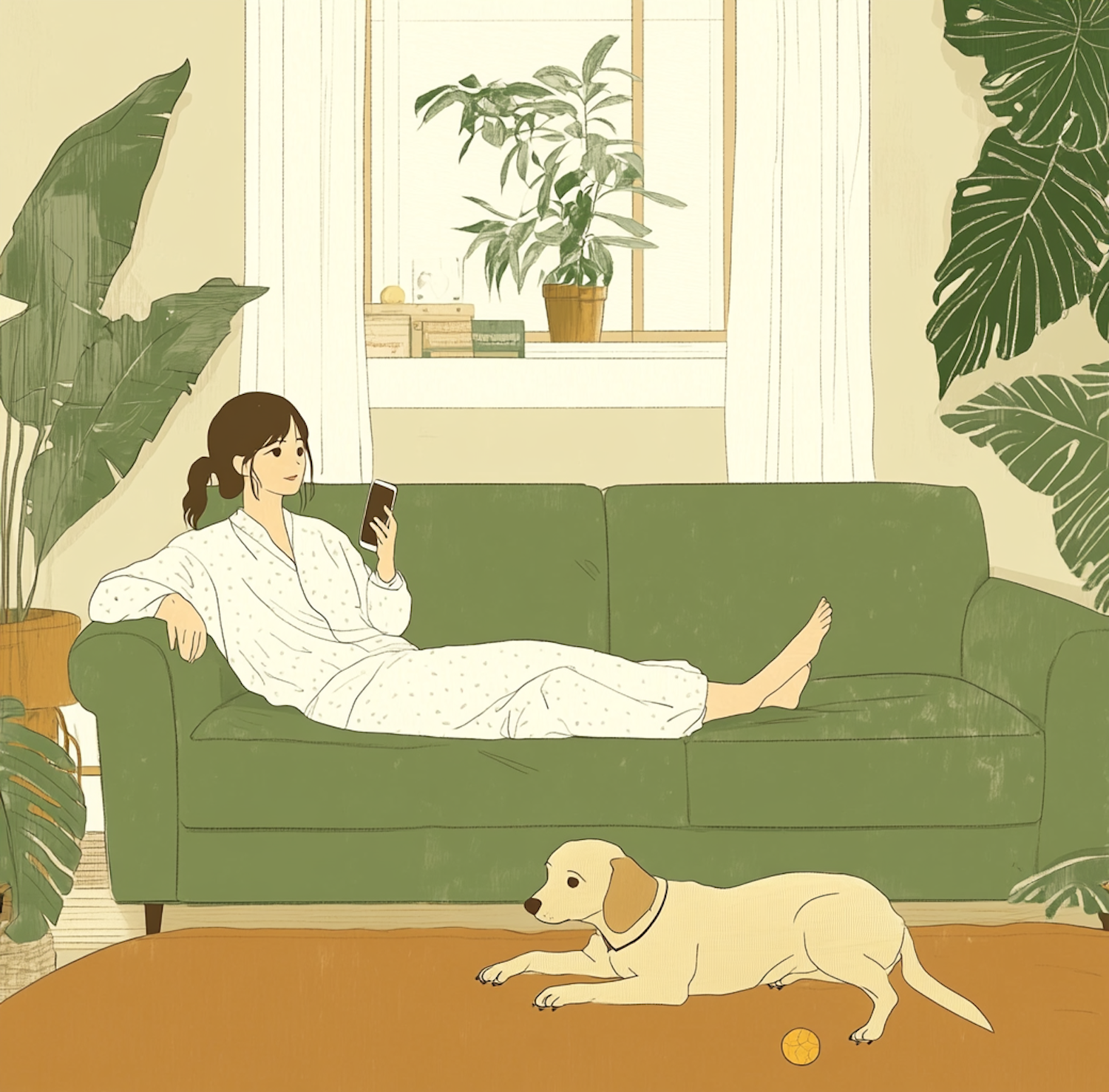 Woman in pajamas relaxes on a green sofa with a smartphone, while a Labrador rests nearby. Cozy room with plants and soft lighting.