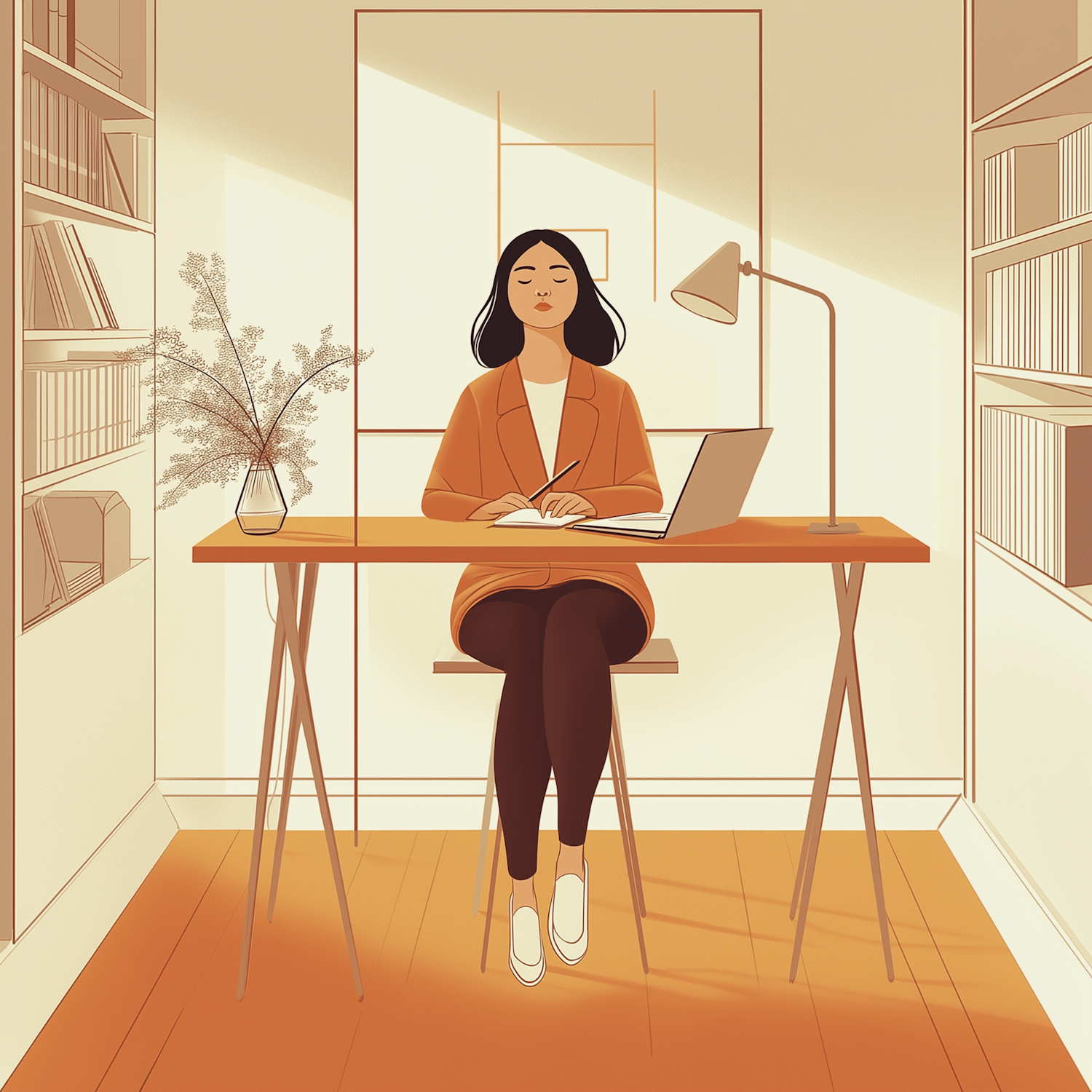 Illustration of a woman meditating at a desk with a laptop, surrounded by bookshelves in a warm, minimalist room.