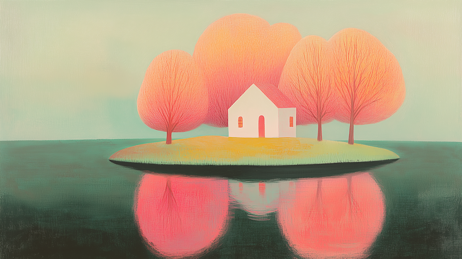 Dreamy illustration of a white house on an island with pink-orange trees, reflected in calm water. Perfect for serene, artistic vibes.