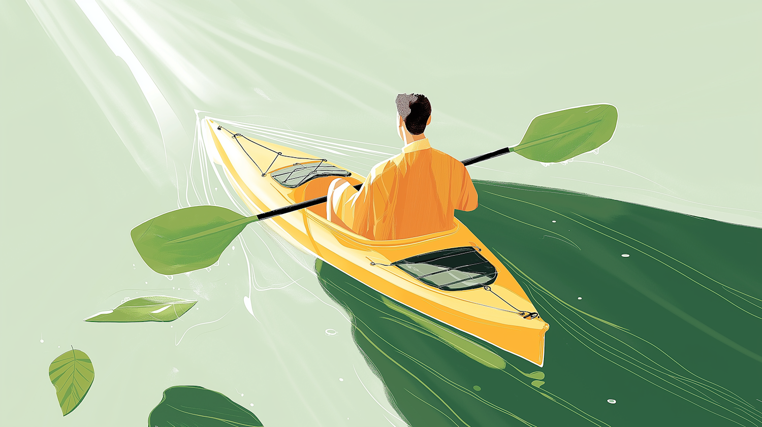 Illustration of a person kayaking on green water with leaf-shaped paddles and floating leaves, under soft sunlight.