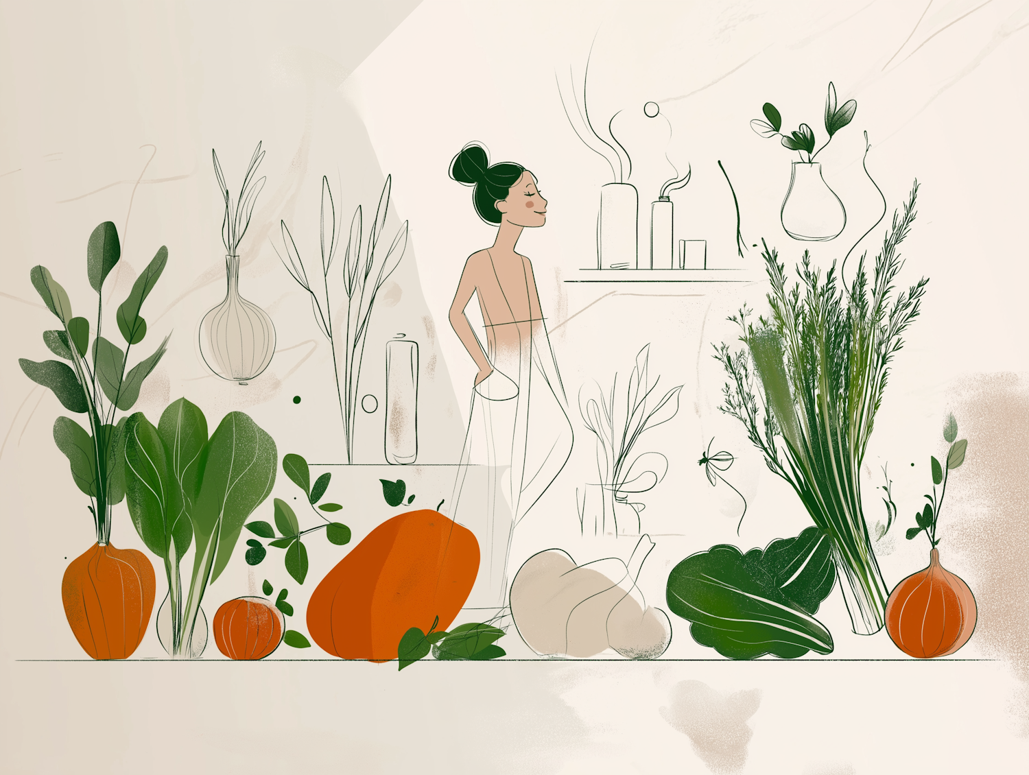 Stylized illustration of a woman with vegetables, featuring pumpkins and greens in a harmonious green and orange palette.