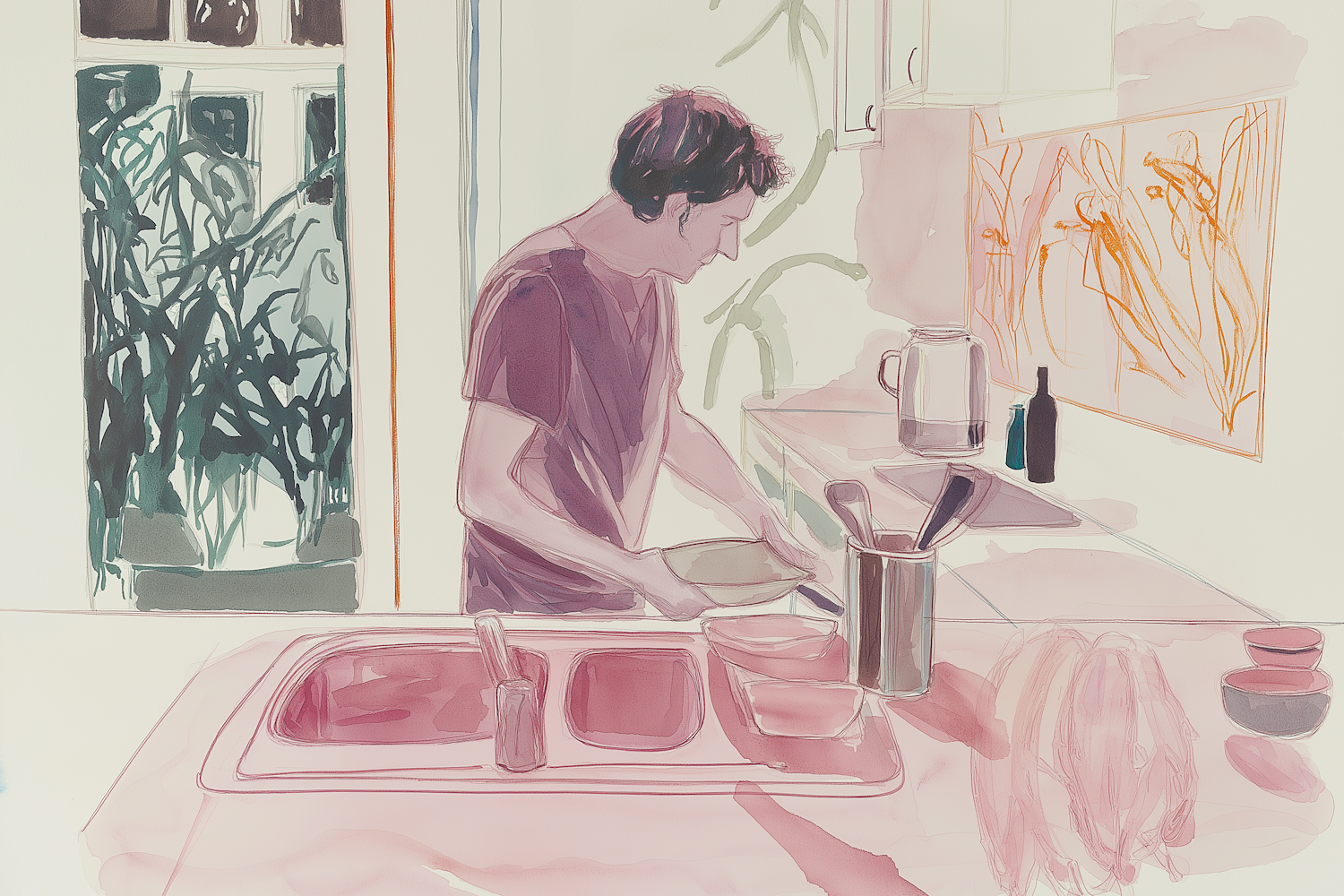 Watercolor-style illustration of a person in a serene kitchen, surrounded by soft hues, plants, and artistic details.