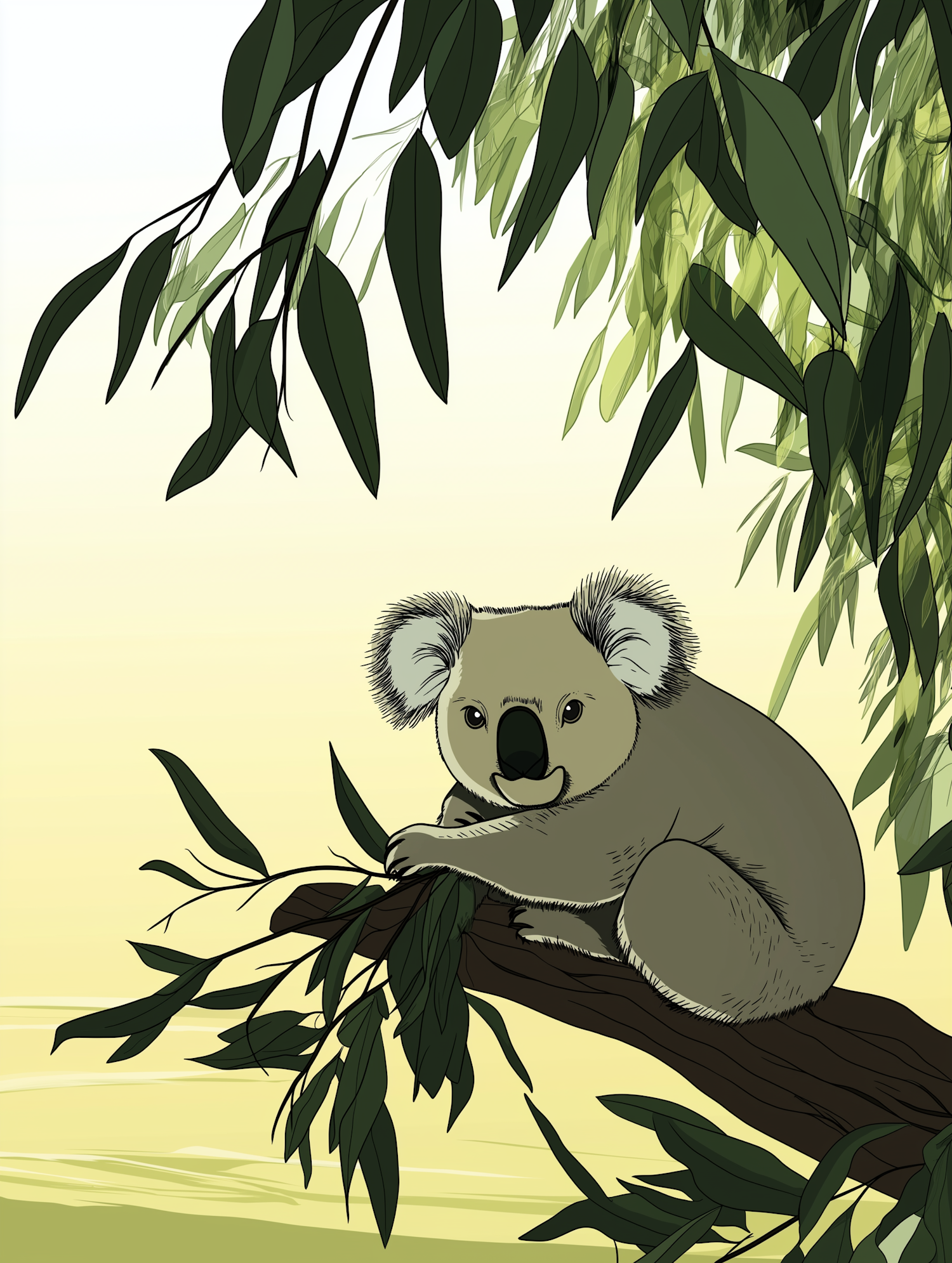 Illustration of a koala on a tree branch with lush green leaves and a serene yellow background.