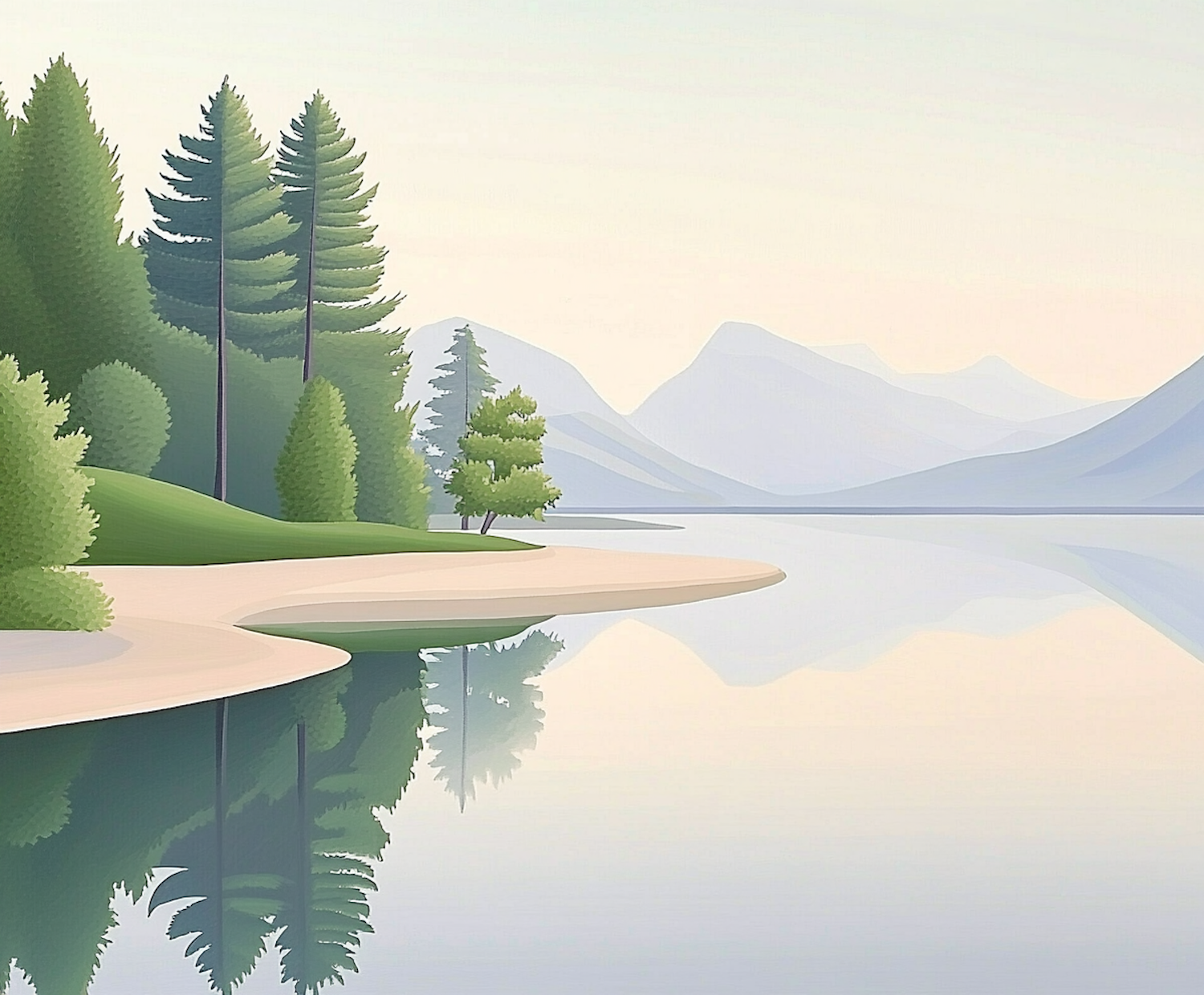 Tranquil lake scene with pine trees, sandy shore, and distant mountains in soft colors, reflecting serenity and natural beauty.