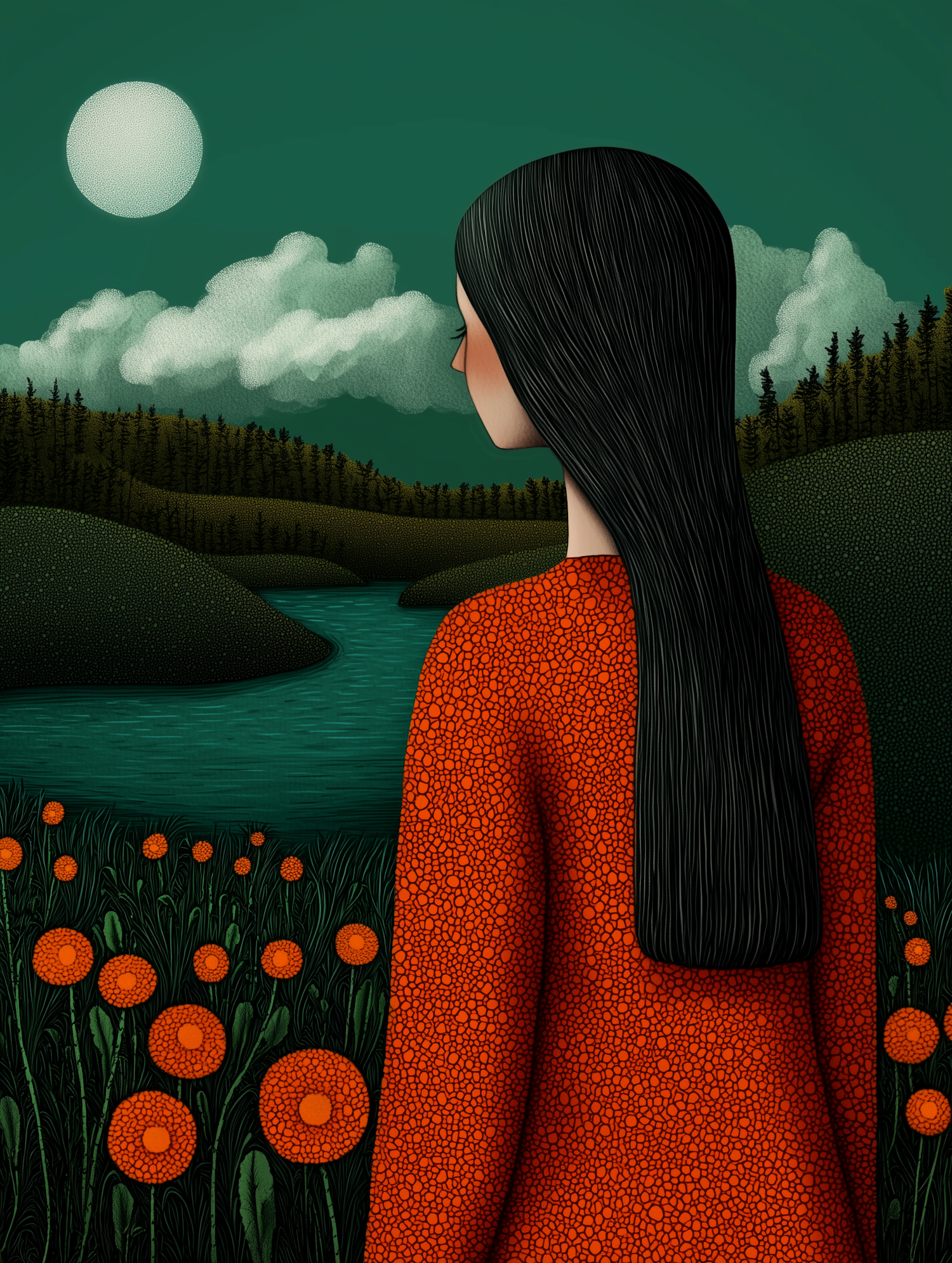 Illustration of a woman in an orange dress amidst orange flowers, gazing at a moonlit landscape with green hills and a river.