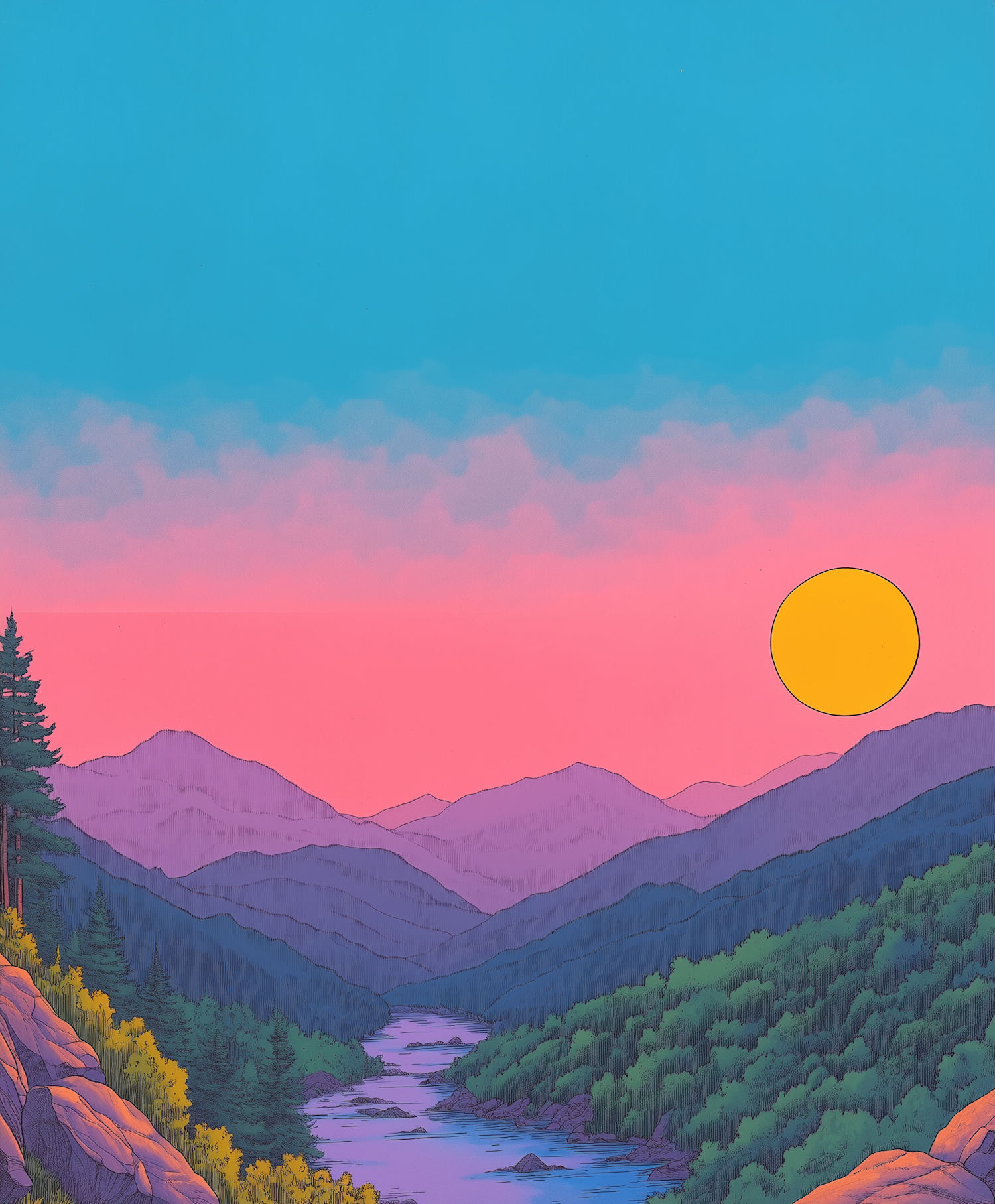 Vibrant sunset landscape illustration with colorful sky, mountains, and a winding river through lush greenery.