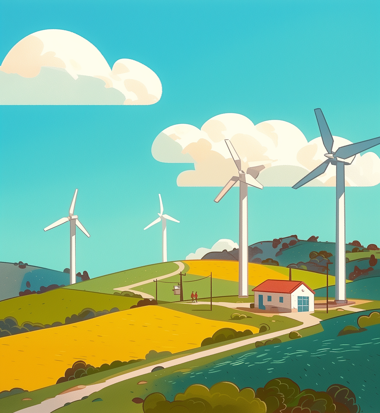 Colorful illustration of wind turbines on rolling hills with a small house and clear blue sky, highlighting renewable energy.