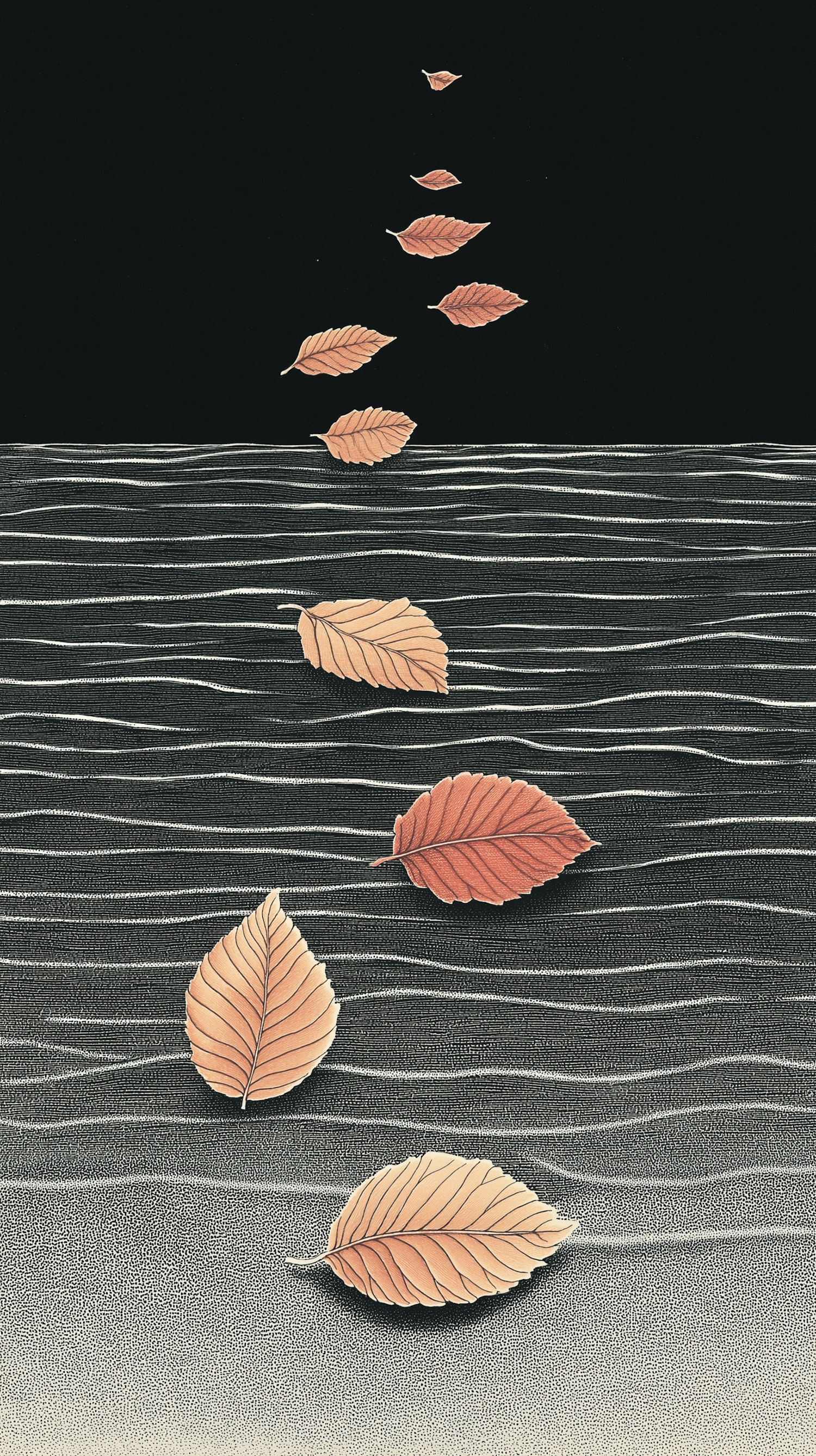Surreal illustration of autumn leaves drifting over a textured, wavy surface resembling water, set against a dark background.