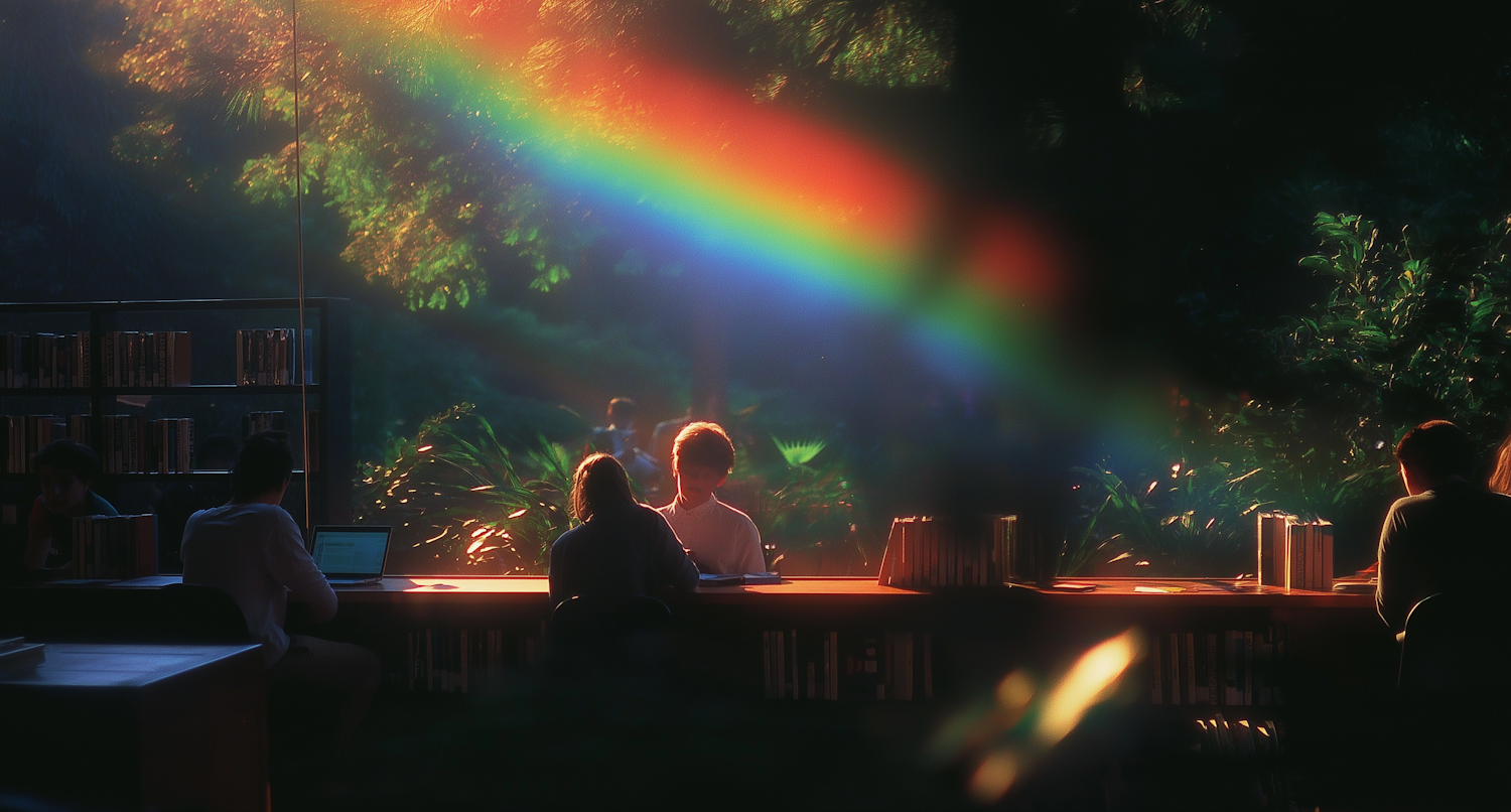 A tranquil library scene with a rainbow of light streaming in, individuals reading and working, and lush greenery visible outside.