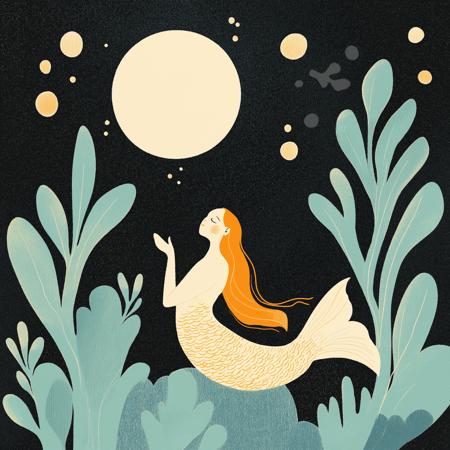 Whimsical mermaid illustration with orange hair, reaching for a glowing orb in a dark, magical underwater scene with teal seaweed.
