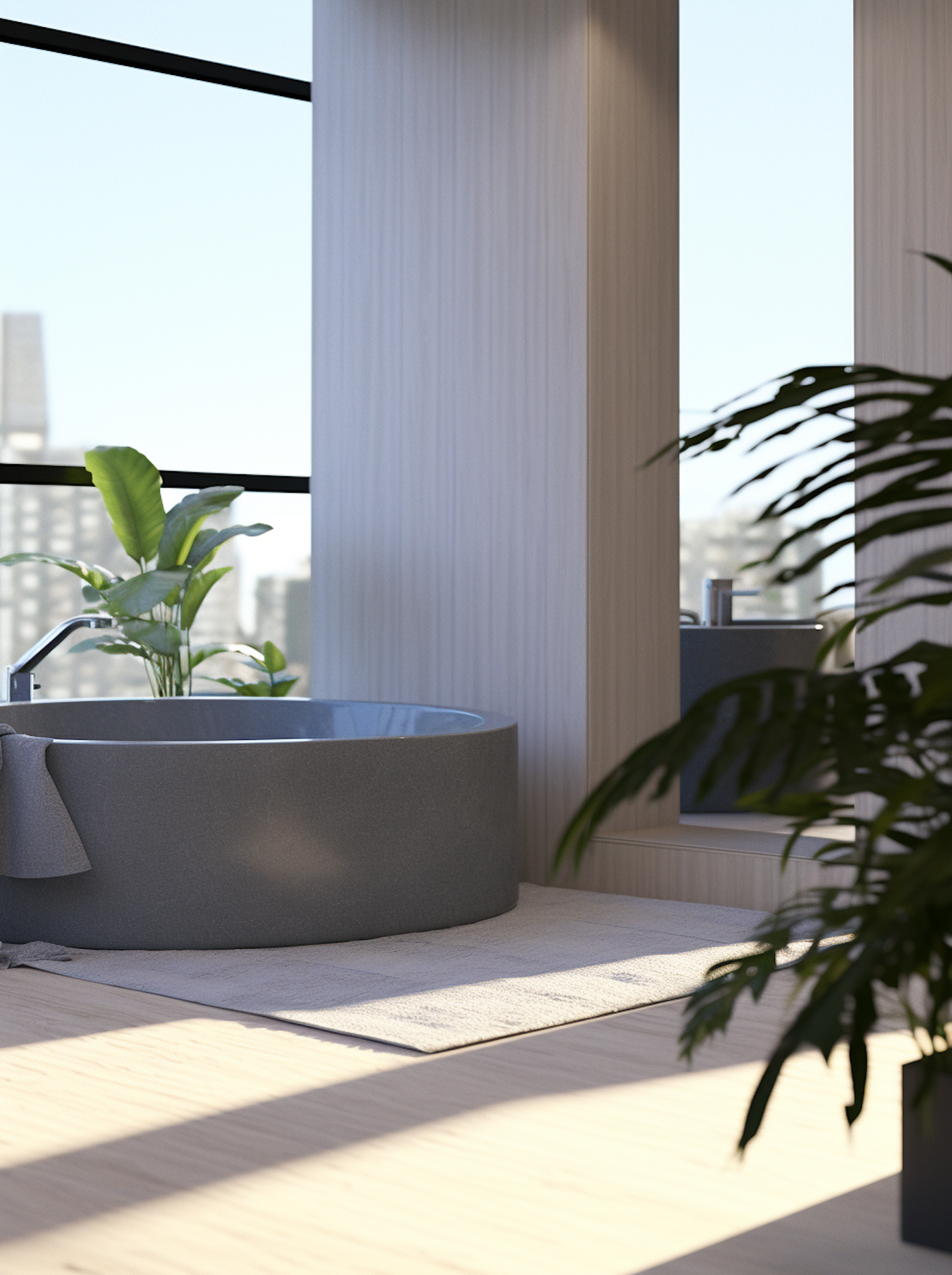 Modern bathroom with a round gray tub, large window, and lush plants, creating a serene and airy atmosphere.