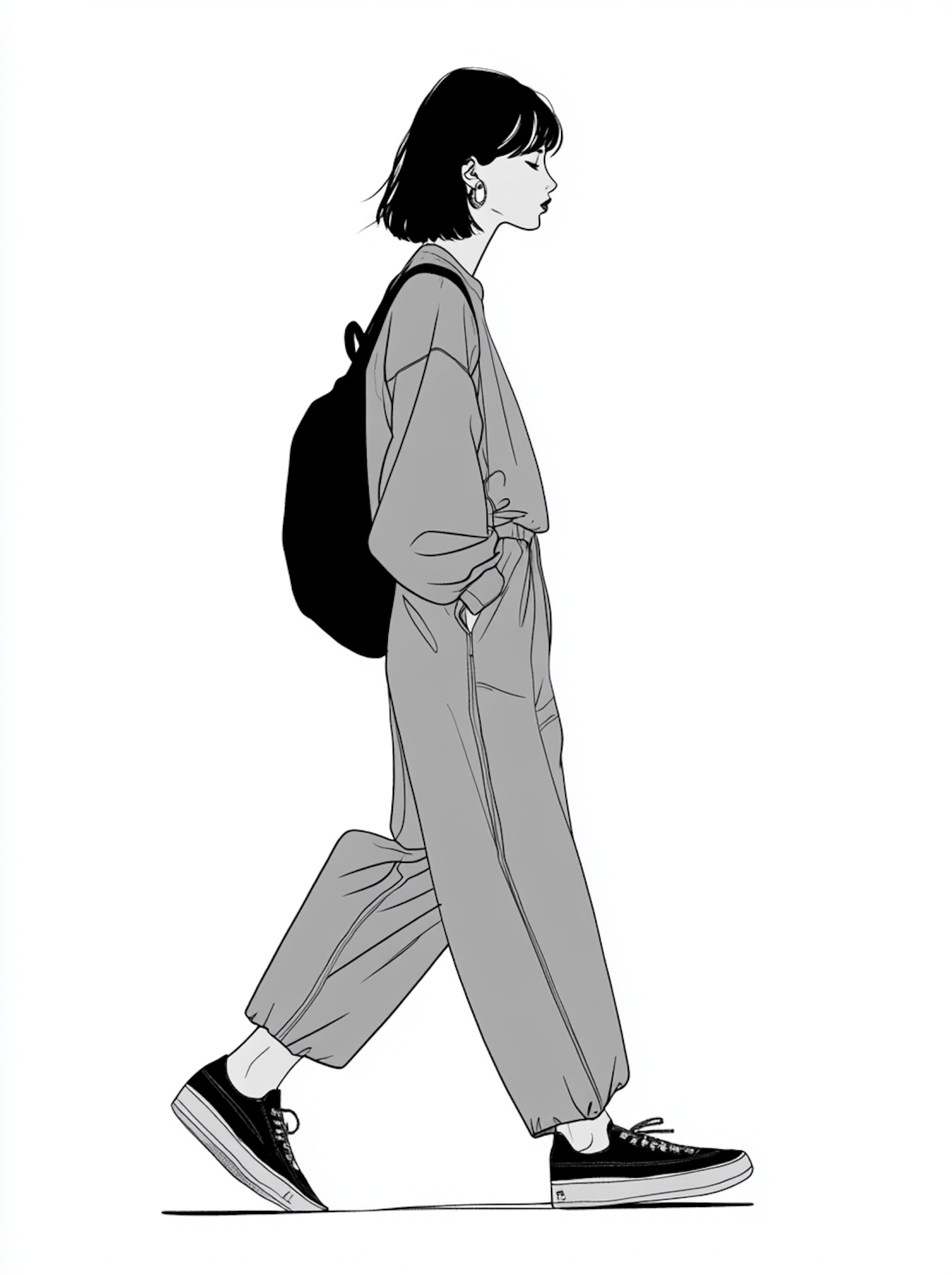 Minimalist illustration of a young person walking with a backpack, wearing casual attire and sneakers, set against a plain white background.