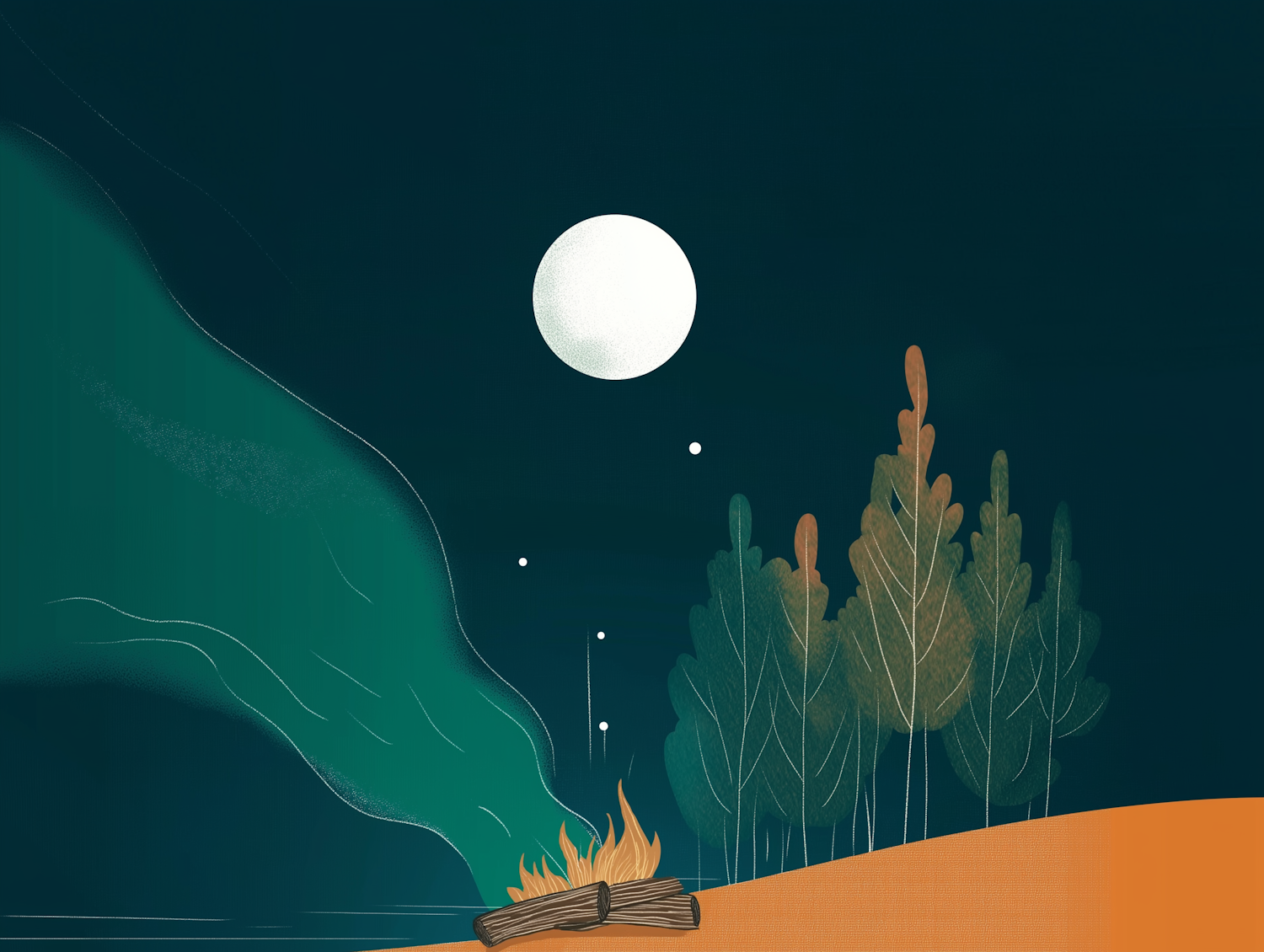 Illustration of a serene night scene with a full moon, campfire, and stylized trees. Perfect for nature and camping themes.