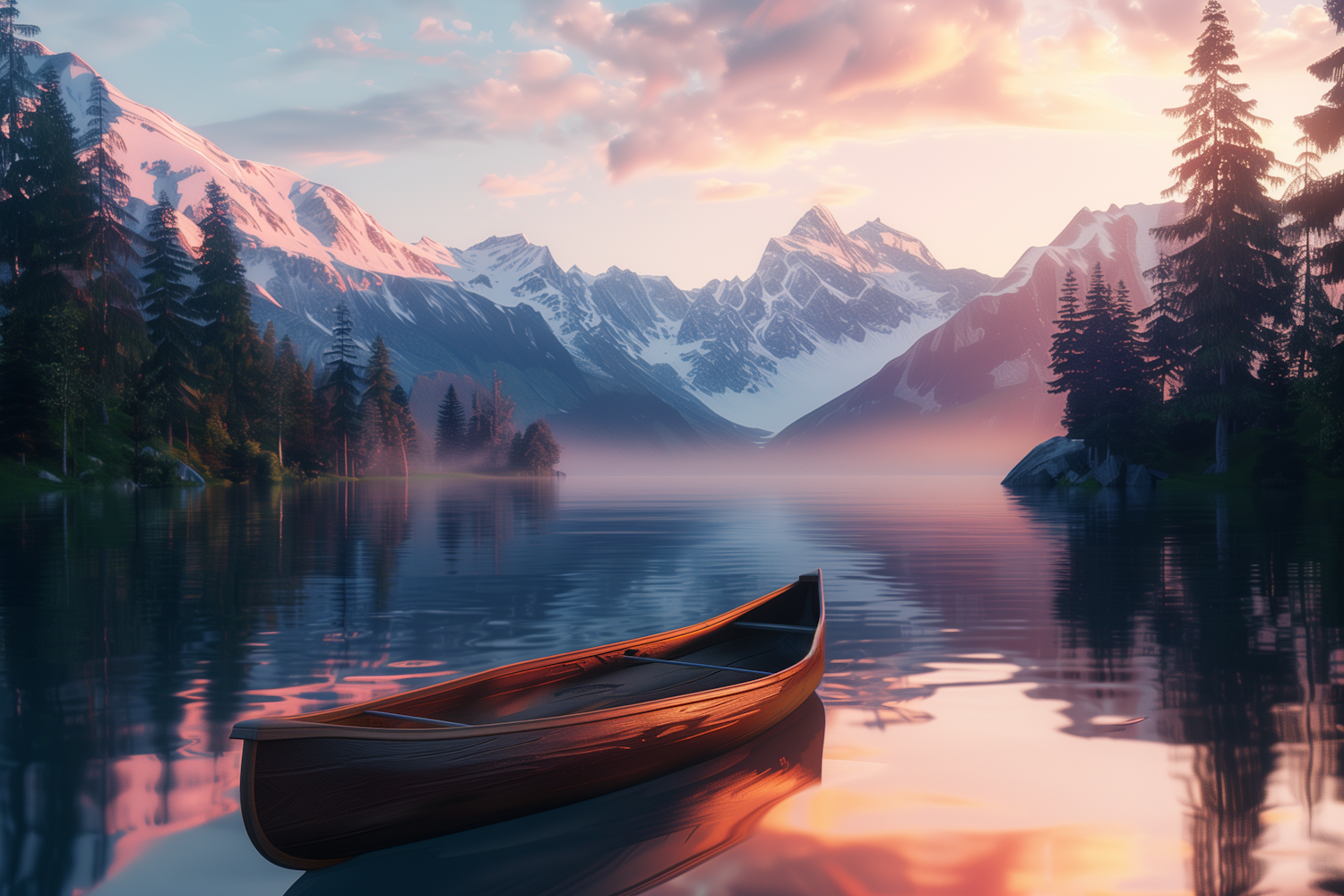 Tranquil lake at sunset with a wooden canoe, snow-capped mountains, and evergreen trees reflecting in calm waters.