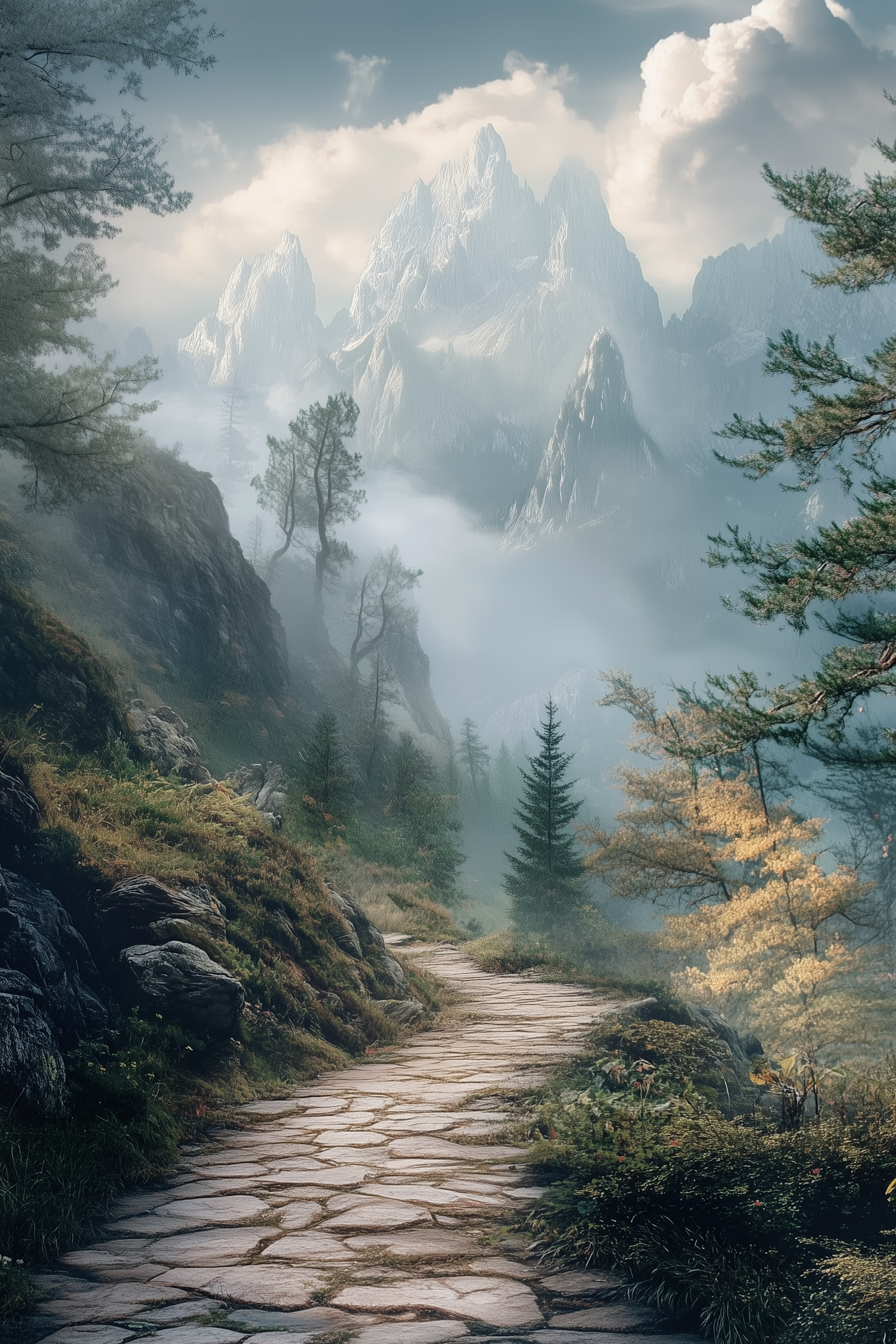 Mystical mountain landscape with a winding stone path, lush greenery, and misty peaks. Perfect for nature lovers and adventurers.