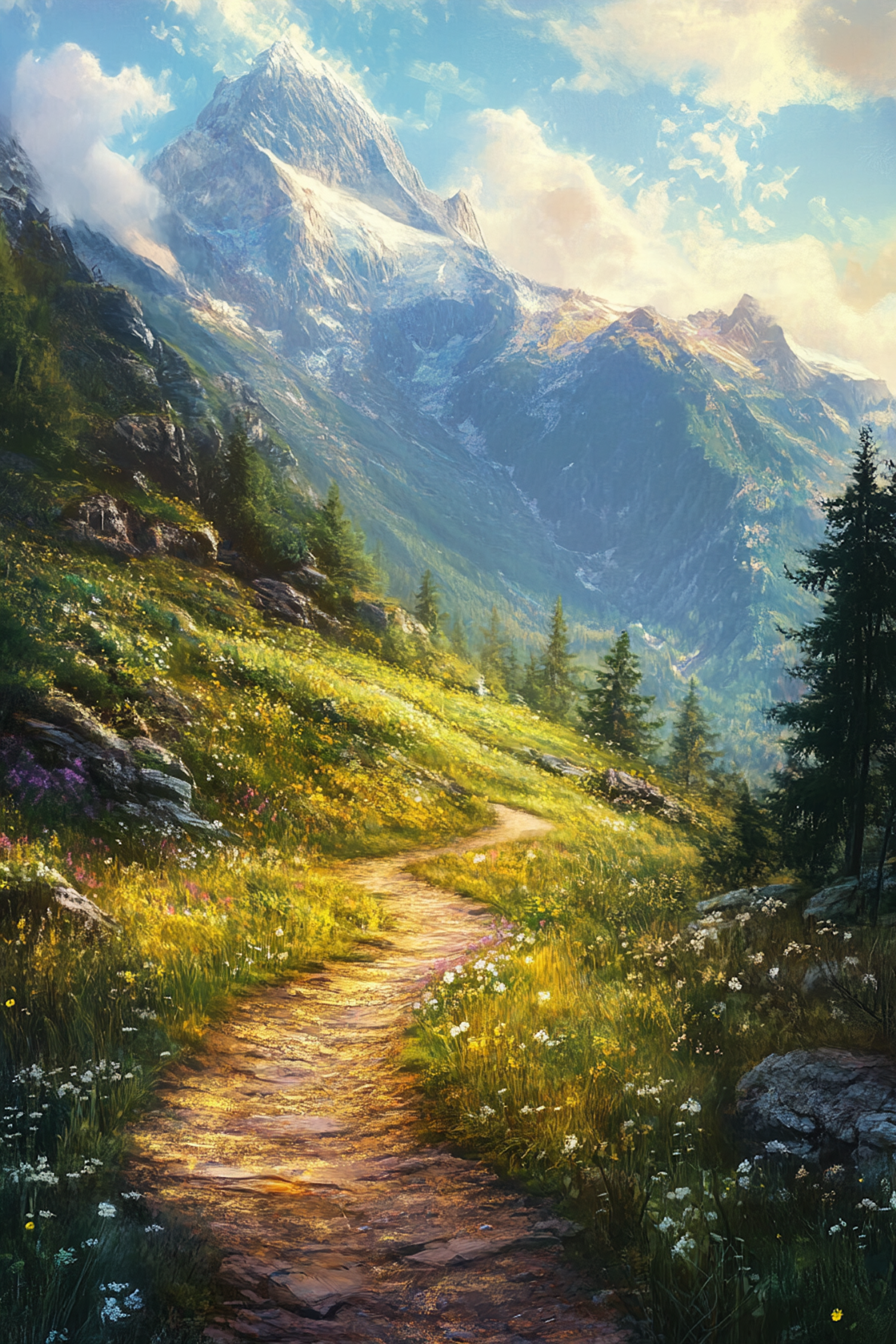 Scenic mountain landscape with a sunlit path through a vibrant meadow, leading to snow-capped peaks under a clear blue sky.